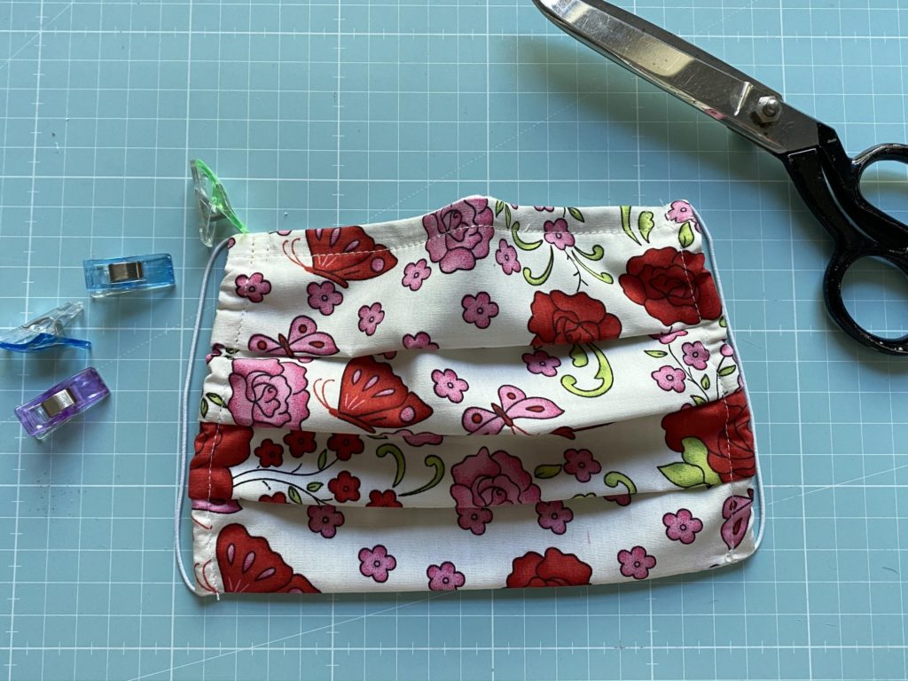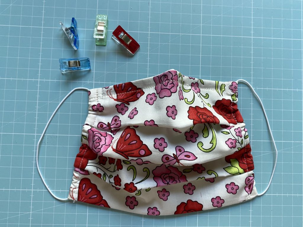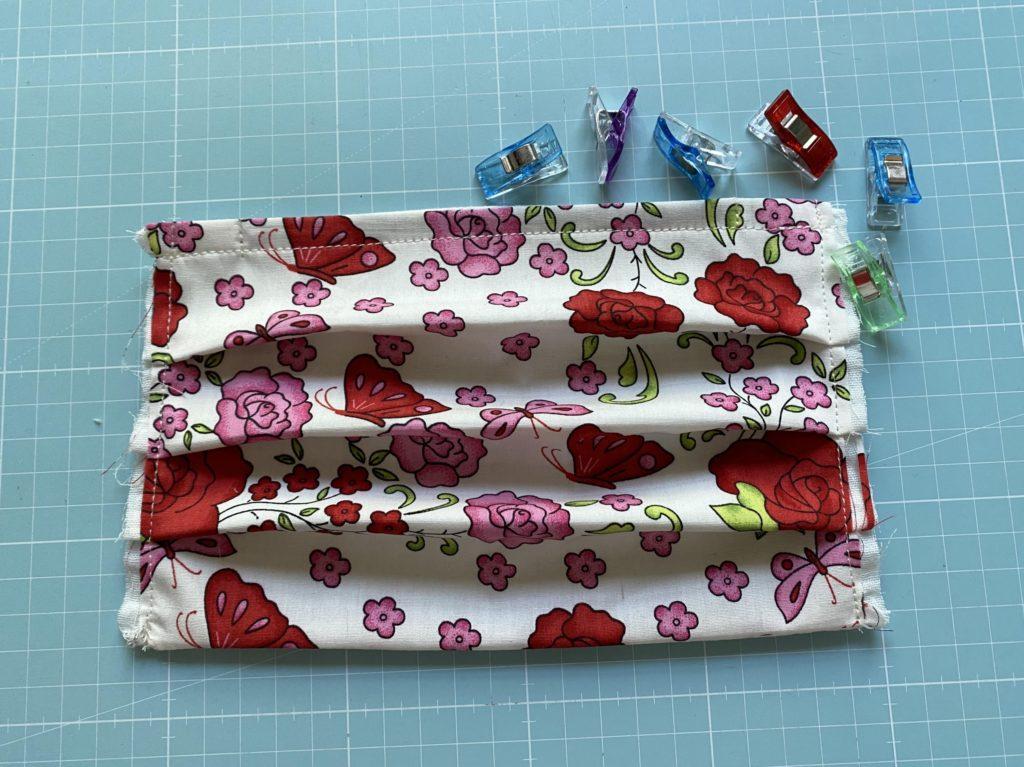 Du faltest die fast fertige Mund-Nasenmaske zur Hälfte und dann jede der Hälften noch einmal, bügelst kurz darüber, so dass du 3 Falten erhältst. Dann nimmst du jede einzelne Falte hoch und steckst diese in einem Abstand von ca. 1 cm fest und steppst die Seiten 0,5 cm ab.