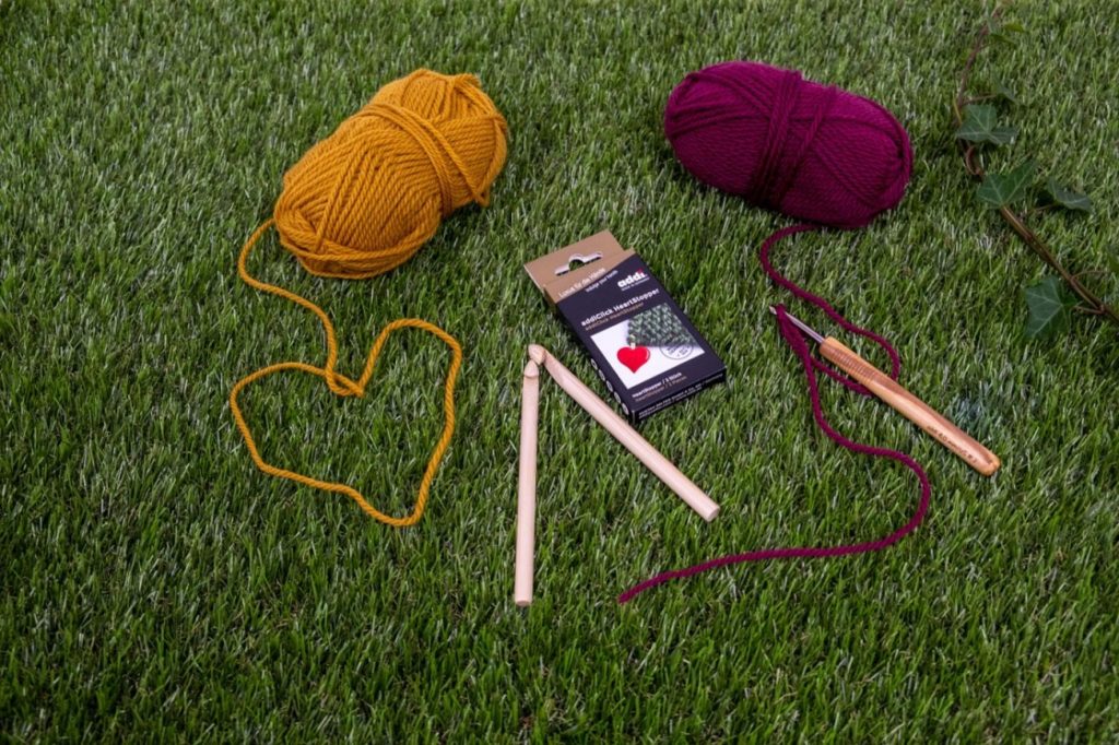 - Nützliches Zubehör für den Strick- und Häkelbegeisterten DIYster von addi wie eine edle Häkelnadel mit einem Olivenholzschaft, zwei dicke Häkelnadeln aus Bambus und addiClick Heartstopper.