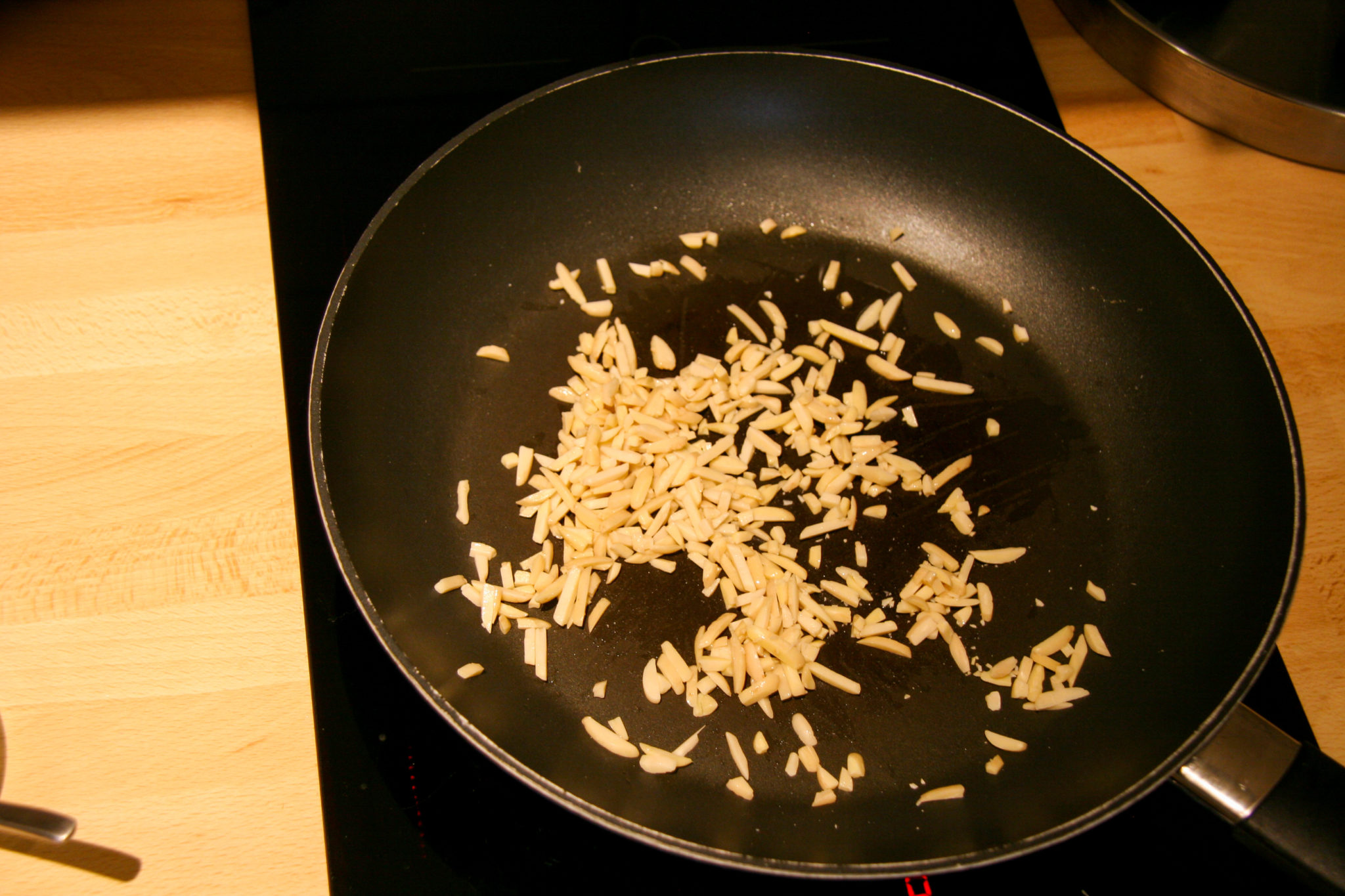 Für einen meiner Rezeptvorschläge habe ich Mandelsplitter kurz geröstet. Das führt dazu, dass der Mandelgeschmack sich intensiver entfalten kann. Das macht das Ganze besonders lecker! 🙂