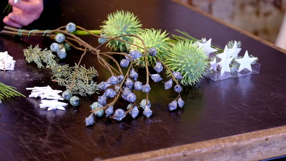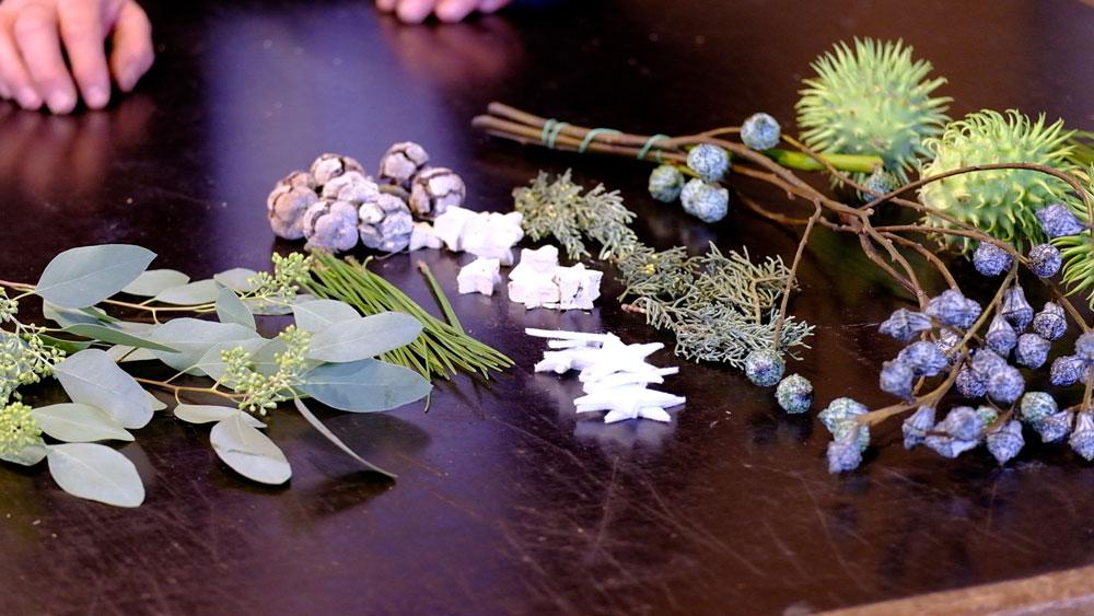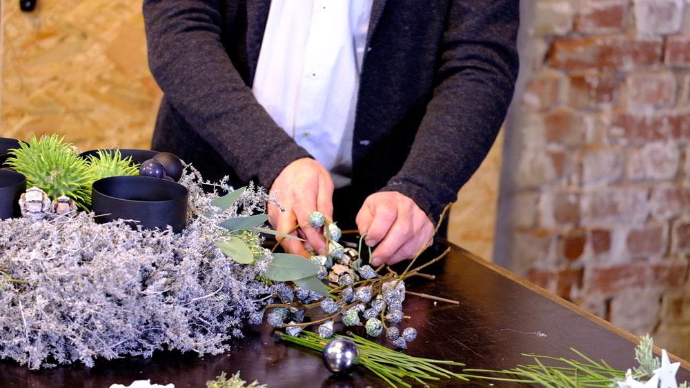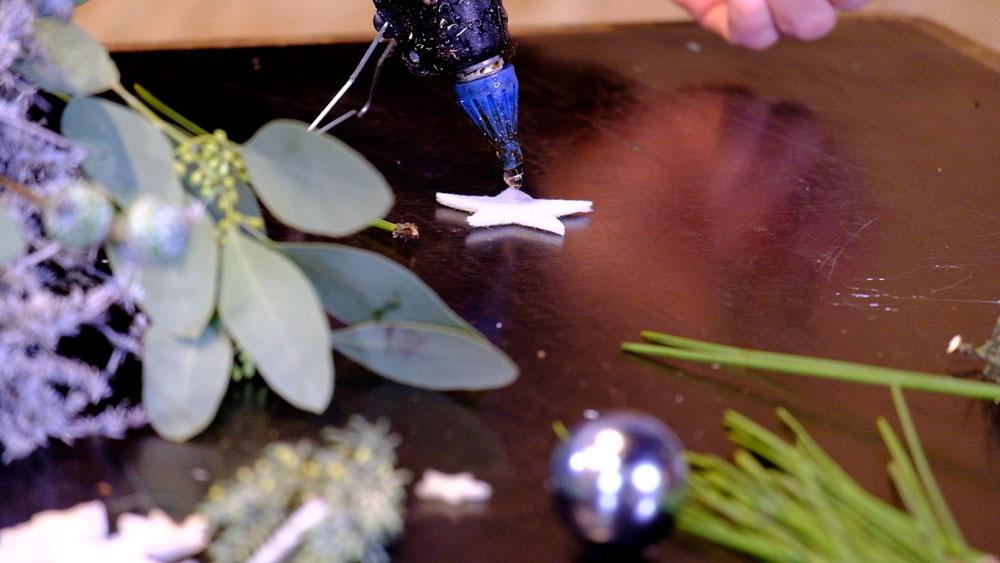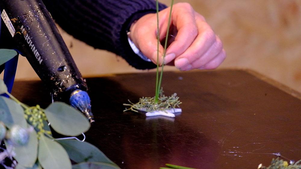 Jetzt werden die Eukalyptuszweige mit den Fruchtständen in den Asparagus-Kranz gesteckt. Damit die Zweige besser halten, werden die Stielenden mit Heißkleber bestrichen und dann eingesteckt. Genauso verfahren wir mit den Eukalyptusfrüchten.