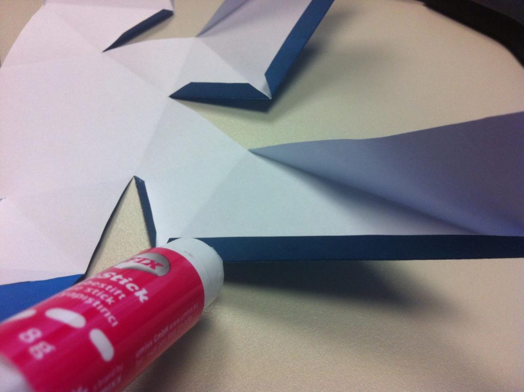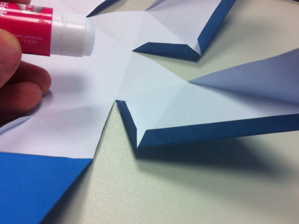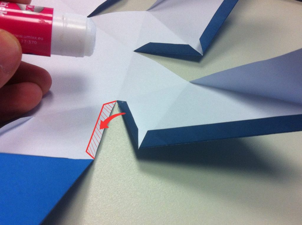 Nun schmieren wir etwas Kleber auf die Faltlaschen, die wir in Schritt 3 bereits gefaltet haben. Diese kleben wir dann an der weissen Fläche daneben fest. Ich habe euch das auf den folgenden Bildern eingezeichnet, damit es verständlicher wird (Die Faltlasche muss auf die in rot eingezeichnete Fläche geklebt werden).