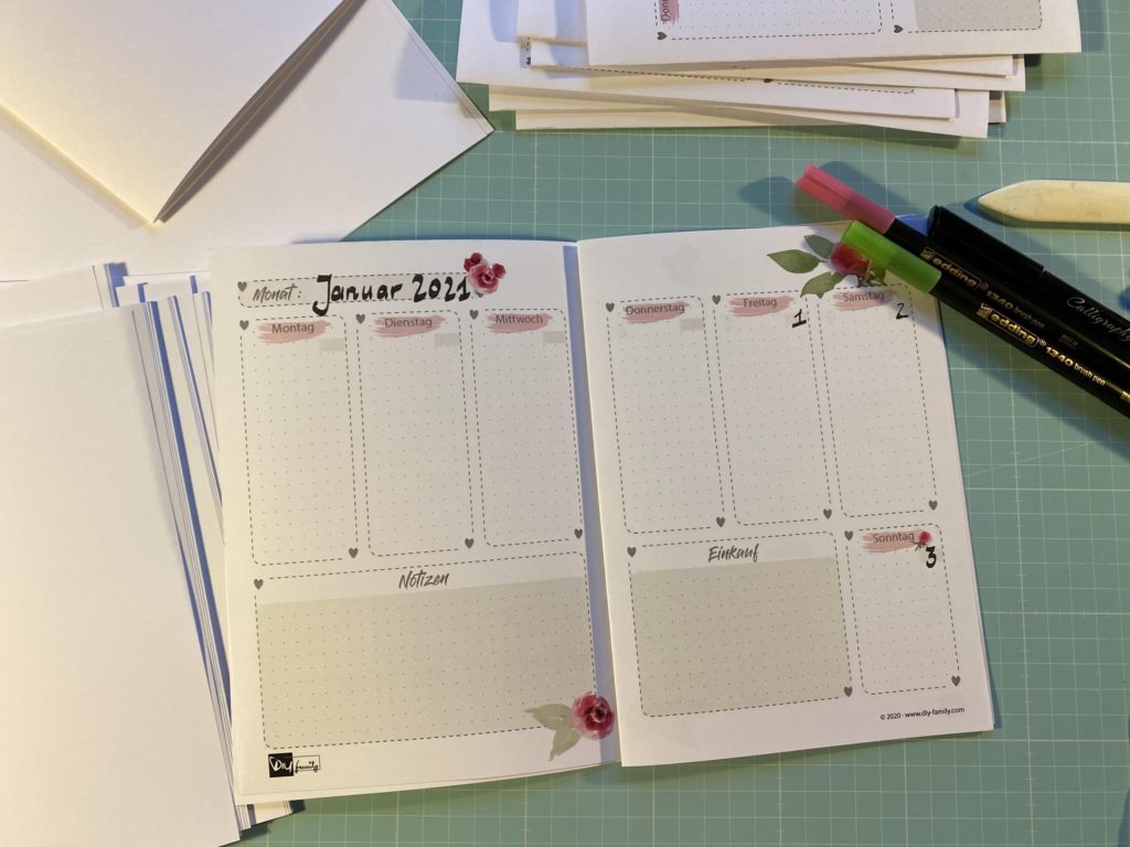 Hallo, ihr Lieben. Hier ist Ella. Ich habe mich an ein echt großes Projekt ran gewagt, denn ich wollte meiner Freundin zu Weihnachten ein ganz persönliches Bullet-Journal schenken. Dazu habe ich erst einmal eine Kalender-Vorlage entworfen, die ihr euch gerne als PDF runterladen könnt. Und dann habe ich mit diesen Kalender-Blättern ein Buch gebunden. Herausgekommen ist ein super individuelles selbstgemachtes Bullet-Journal. Ich finde, es ist richtig toll geworden. Versucht es auch einmal. Mit meiner Schritt-für-Schritt-Anleitung und den Vorlagen ist es auch wirklich nicht sehr schwer.