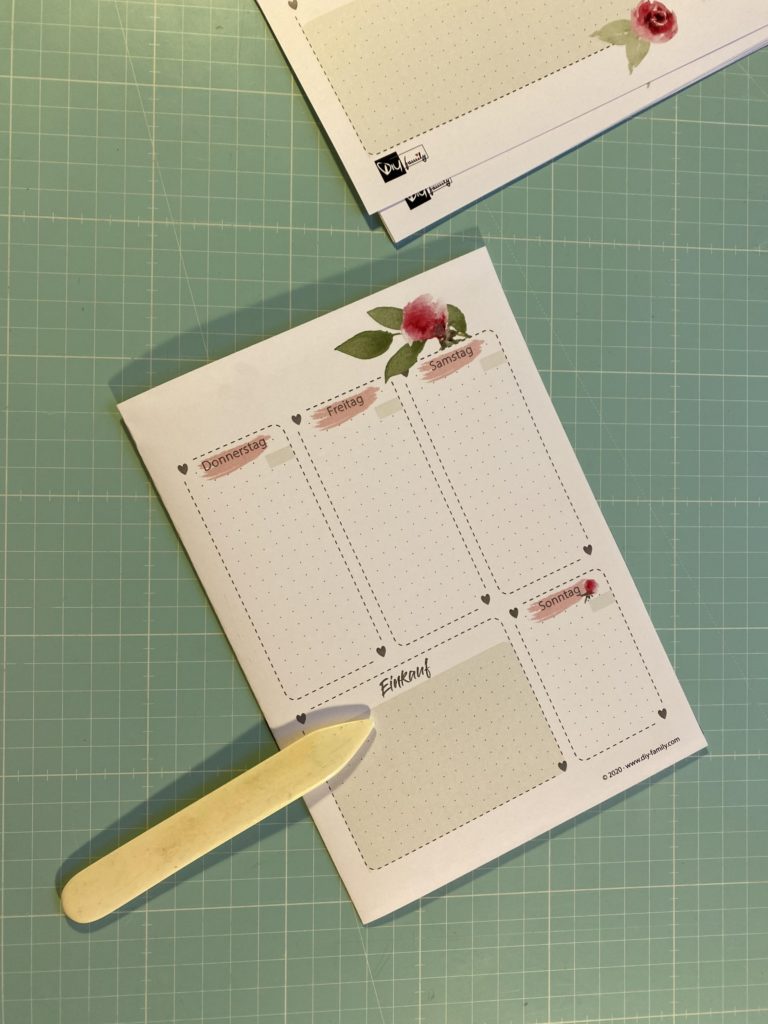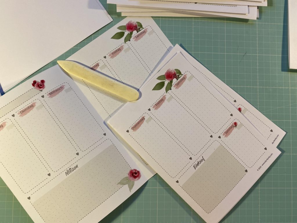 Dann beginnst du, das Papier genau in der Mitte zu falten. Dazu benutzt du das Falzbein, so bekommt das Papier einen kräftigen Falz. Die einseitige Vorlage faltest du so, dass der Druck in der Mitte liegt. Außerdem falzt du noch ca. 10 weiße Blätter in der Mitte. Dann legst die Papiere wie folgt zusammen: 1 weißes Blatt, 1 einseitig bedrucktes Blatt und 3 doppelseitig bedruckte Blätter – also immer 5 Blätter sind ineinander geschoben. Mit einem solchen „Block“ hast du 7 Kalenderwochen abgedeckt. Für mein Bullet-Journal habe ich 7 solcher Blocks gemacht und den achten und letzten Block mit 2 weißen Papieren, einem einseitig bedruckten Blatt und 2 doppelseitig bedruckten Blättern. So hast du insgesamt 54 Wochen und kannst 2 Wochen des folgenden Jahres berücksichtigen.