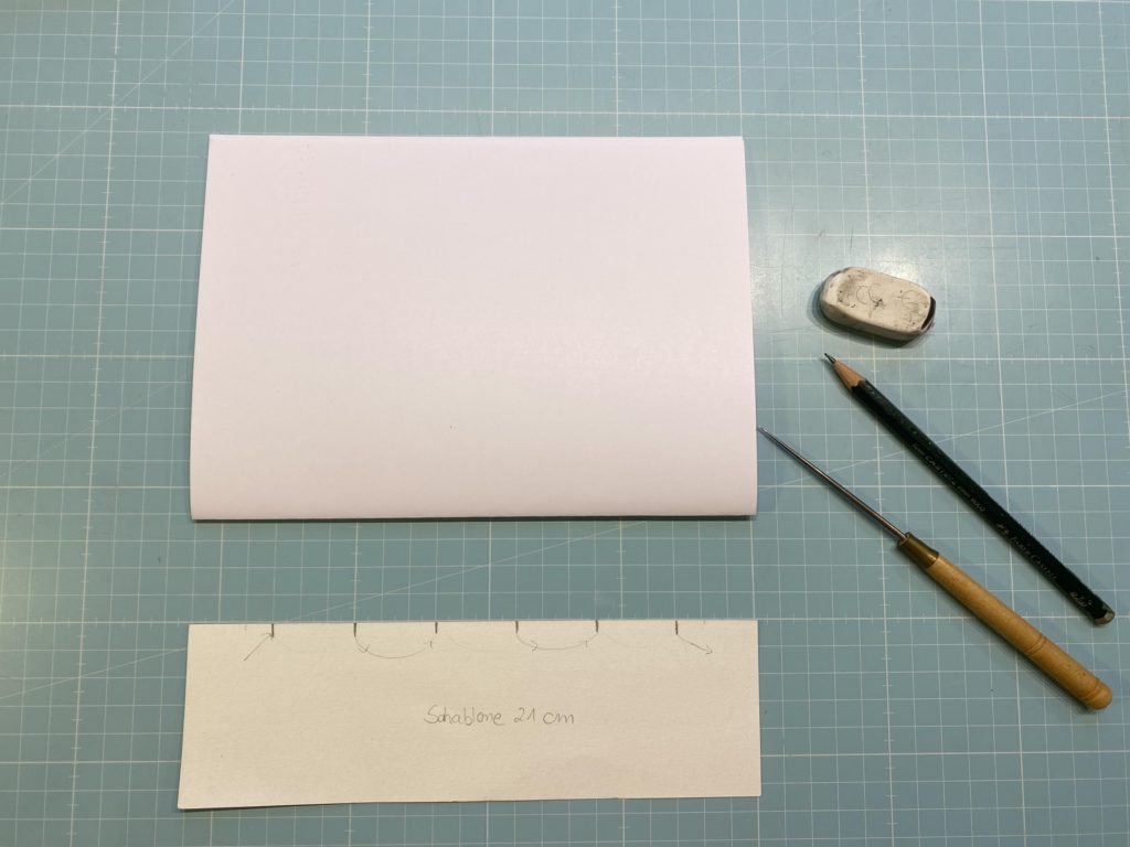 Du fertigst jetzt die Schablone an. Dazu nimmst du den Karton und passt ihn genau der Höhe deines Bullet-Journals an. Da die Seiten die Breite eines DIN A4-Blattes haben, muss deine Schablone 21 cm Breite haben. Du kennzeichnet alle 3 cm. Diese Stellen werden gleich mit der Ahle gelocht. Du legst den oberen Block auf eine kleine Erhöhung. Dann legst du die Schablone in die Mitte des oberen geöffneten Blocks und ziehst die Kante des Blocks knapp über die Erhöhung und stichst mit der Ahle an allen gekennzeichneten Stellen Löcher durch alle 5 Blätter. Achte darauf, dass die Löcher genau in der Mitte des Falzes liegen.