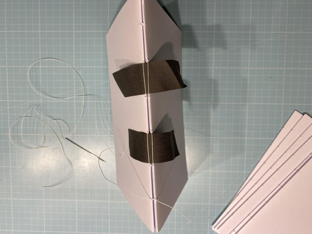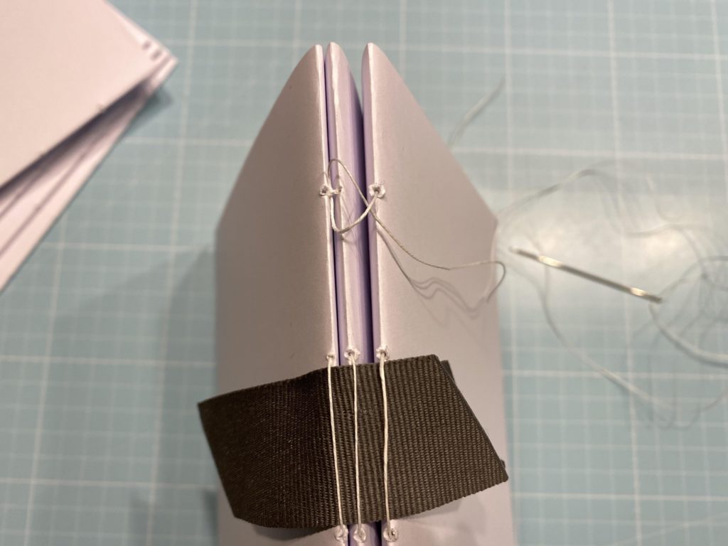 Nun schiebst du die beiden Einlegebänder unter die beiden äußeren Nähte und ziehst den Faden gut stramm, aber achte darauf, dass du ihn am „losen“ Ende nicht rausziehst. Dann legst du den nächsten Block auf den ersten. Achte darauf, dass er richtig herum liegt. Du arbeitest dich also von unten nach oben. Beim Nähen des nächsten Blocks verfährst du genauso wie beim ersten. Wenn du am Ende angekommen bist, ziehst du den Faden wieder gut fest und verknotest das lose Fadenende mit den Nähfaden. Jetzt kommt der dritte Block; du reihst die Blätter wieder normal auf. Am Ende angekommen, musst du die beiden Blocks miteinander verbinden. Dazu schiebst du die Nadel zwischen die beiden ersten Blocks von der Mitte aus unter den Faden und ziehst ihn durch die entstandene Schlaufe und ziehst den Faden gut stramm.