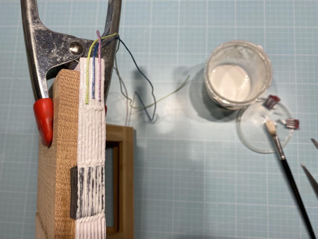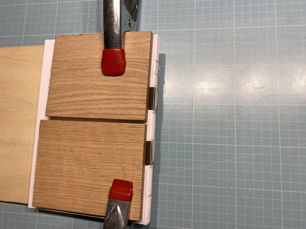 Du legst den gefalteten Fotokarton im Abstand von 5 mm aufeinander auf Zeitungspapier o.ä. Ein „Arbeitspapier“ dient als Kante für den oberen Fotokarton und dann bestreichst du diese Kanten mit Buchbinderleim. Dann legst du die geleimten Vorsatzblätter nacheinander oben und unten sozusagen als Abschluss des gesamten Buchblocks unter die Einlegebänder und presst den gesamten Buchblock in der Buchpresse oder wie ich es hier gemacht habe zwischen ein paar Brettern, gehalten von 2 Zwingen. Achte darauf, dass du den Kantenrand des Buchblocks „rausschauen“ lässt.