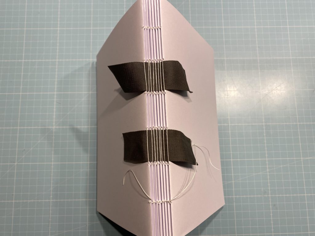 Im folgenden Schritt bringst du die Lesebänder und die Kapitalbändchen an. Dazu nimmst am besten verschieden farbige Bänder und leimst diese an die obere Kante an. Kurz antrocknen lassen und noch einmal Leim auftragen. Die Kapitalbändchen schneidest du in der entsprechenden Größe ab und bringst diese oben und unten an. Um die Höhenunterschiede zwischen den Bändern am Buchrücken ein wenig auszugleichen, schneidest du dir drei passende Stücke Papier, die du etwa 3x falten kannst zu. Du leimst jetzt noch einmal den gesamten Rücken und legst die Papierstreifen an, machst etwas Leim darauf und knickst den Streifen zurück. Wenn die Distanz immer noch groß ist, wiederholst du den Vorgang. Den Rest Papier schneidest du ab. Jetzt noch einmal den gesamten Rücken leimen und mit einem der Länge entsprechenden Stück Papier, dass 2x längs gefaltet werden kann, bekleben. Und schon ist der Buchblock fertig.