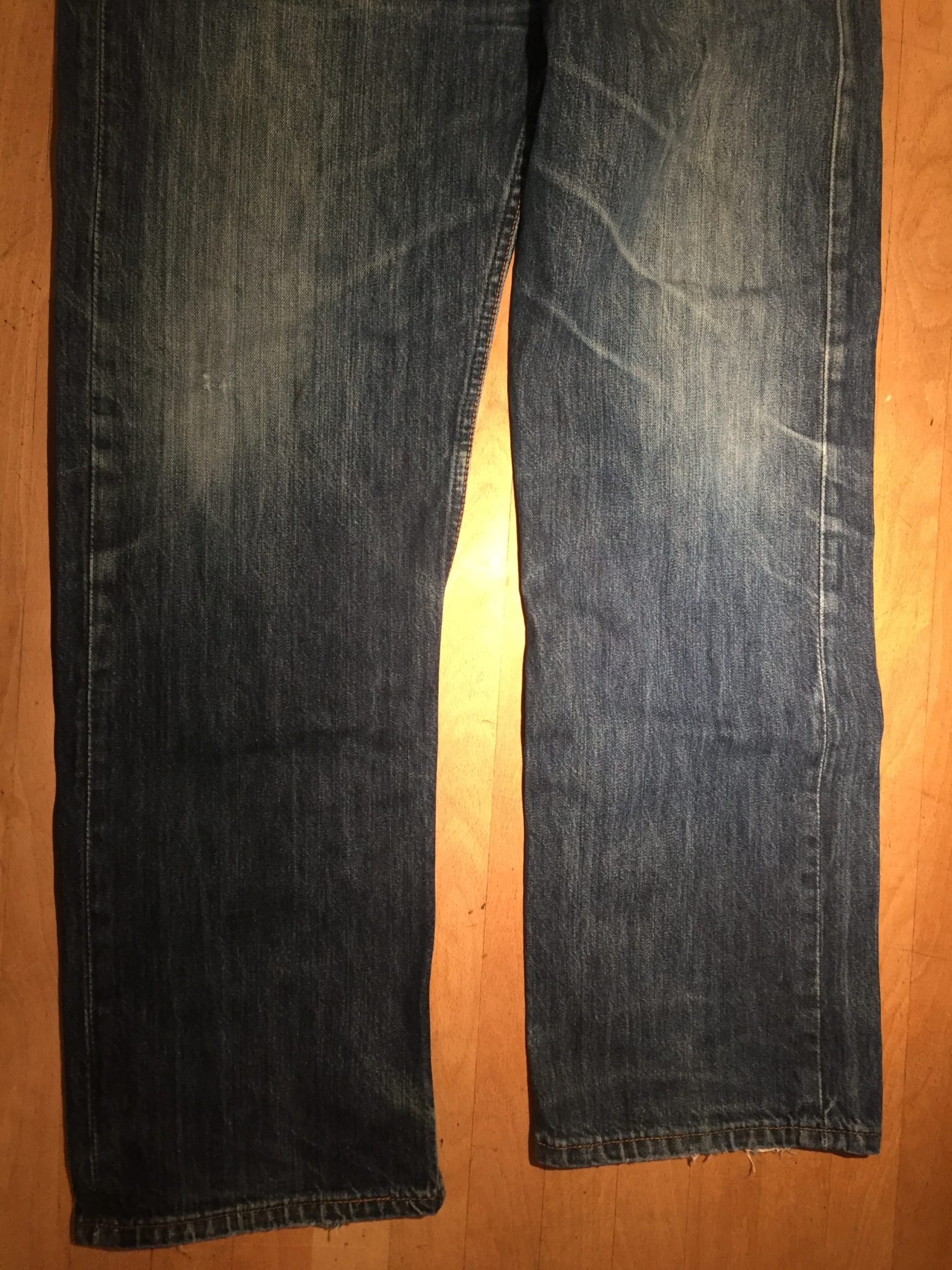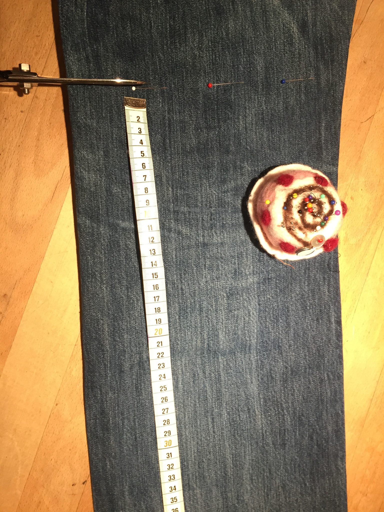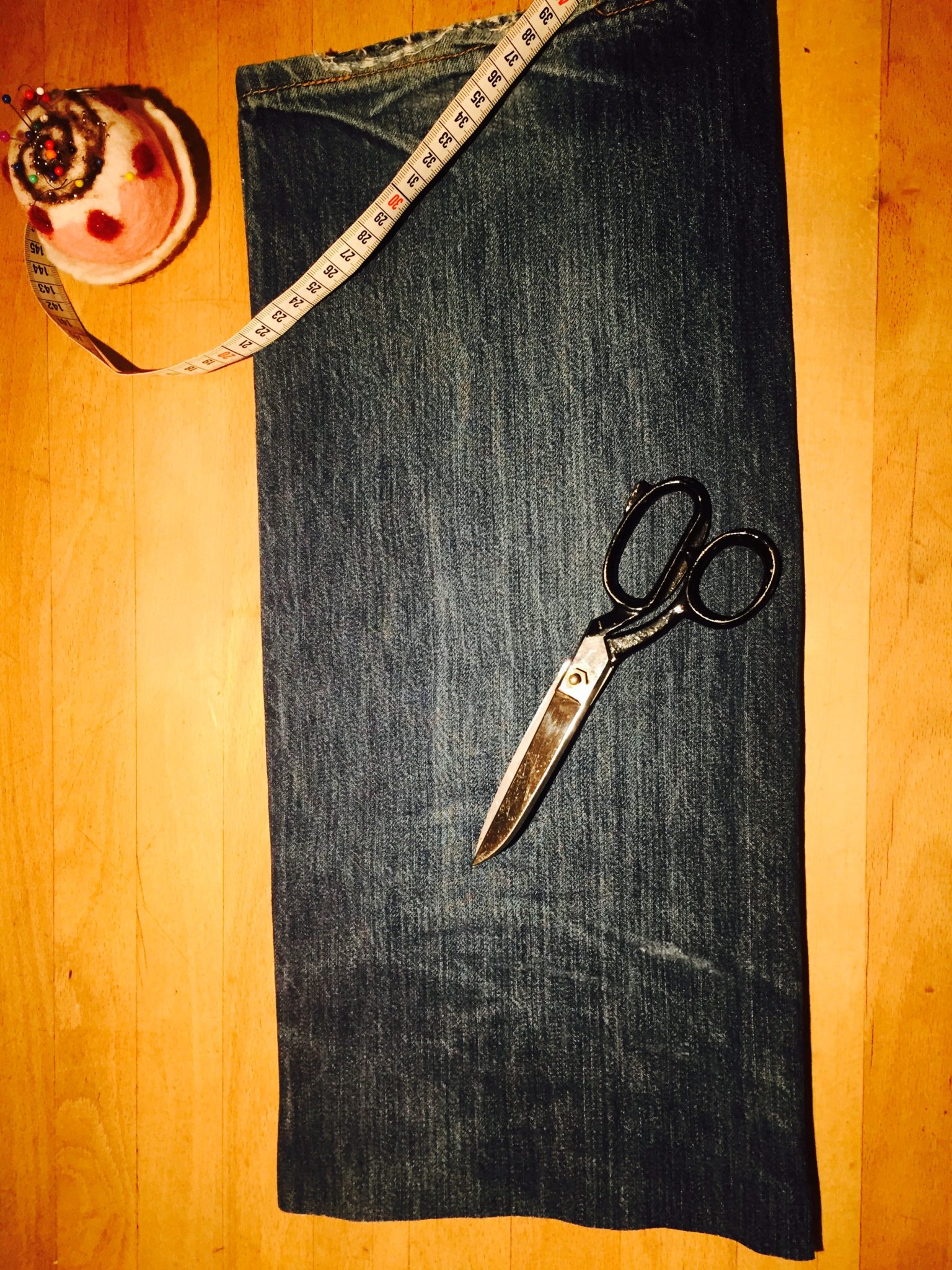 Für meine Upcycling-Jeans-Tasche schneide ich von der Jeans ein Bein in 60 cm Höhe (vom Saum aus gemessen) ab.
