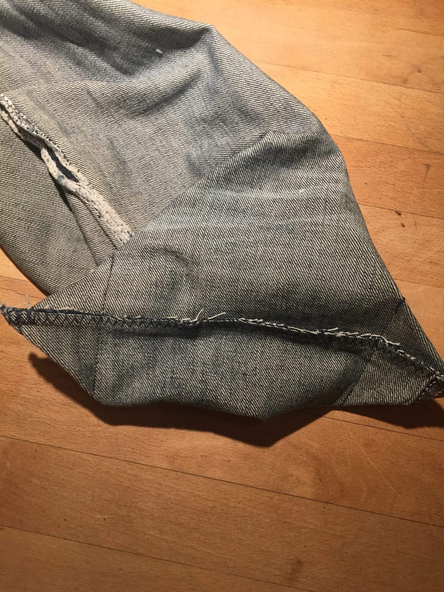 Jetzt wende ich das Hosenbein, sodass die linke Seite zu sehen ist. Der Boden der Tasche wird nun abgesteppt. Ich wähle einen kleinen Stich; der Boden muss u.U. viel aushalten. Die Stoffkanten versäubere ich zusammen mit einem kleinen Zick-Zack-Stich. Dann lege die linke Seitennaht auf die Bodennaht, so dass ein Dreieck entsteht. Von der Spitze des Dreiecks messe ich 4 cm ab und stecke das „Dreieck“ ab. Entlang der abgesteckten Linie steppe ich nun mit kleinem Stich ab. Das gleiche mache ich mit der rechten Seite. Die Tasche wird jetzt wieder auf rechts gewendet. Jetzt kann man sehen, dass ich dem Hosenbein einen Boden genäht habe. Sieht schon aus wie eine Tasche. Fehlt nur noch der Träger.