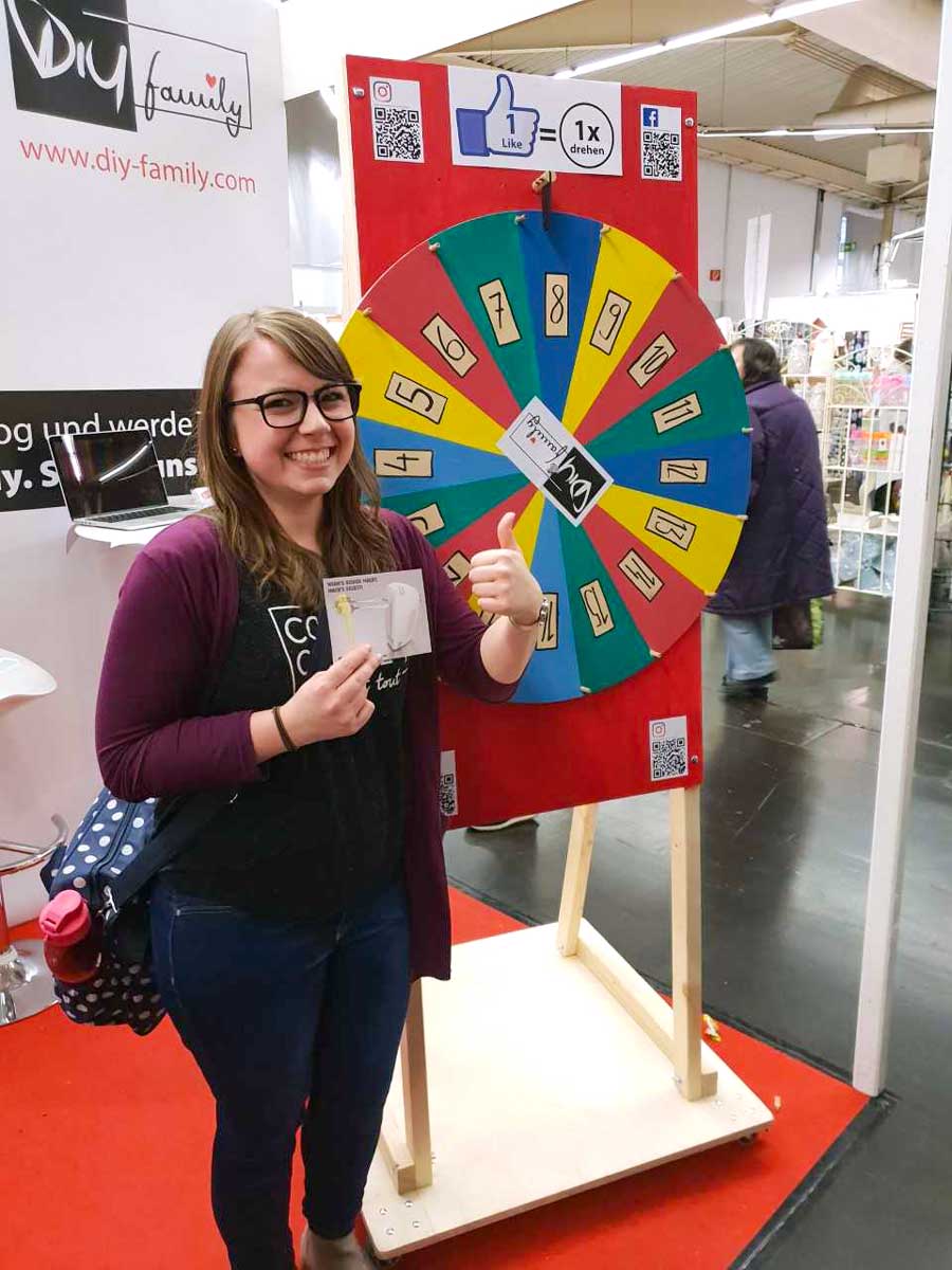 Als Aktion hatten wir uns natürlich auch was schönes für die Besucher überlegt. Bei uns konnte man mit ein bisschen Glück viele schöne Preise gewinnen. Von großen Hauptpreisen wie Nähbücher, über Selbstgemachtes wie Badekugeln bis hin zu kleinen Trostpreisen war alles dabei. Niemand ist bei uns leer ausgegangen! 🙂 Um zu gewinnen musste man einfach nur an unserem (selbstgebauten ;-)) Glücksrad drehen. Ein paar der stolzen Gewinner durften wir am Ende sogar fotografieren und konnten so tolle Erinnerungen festhalten! 🙂