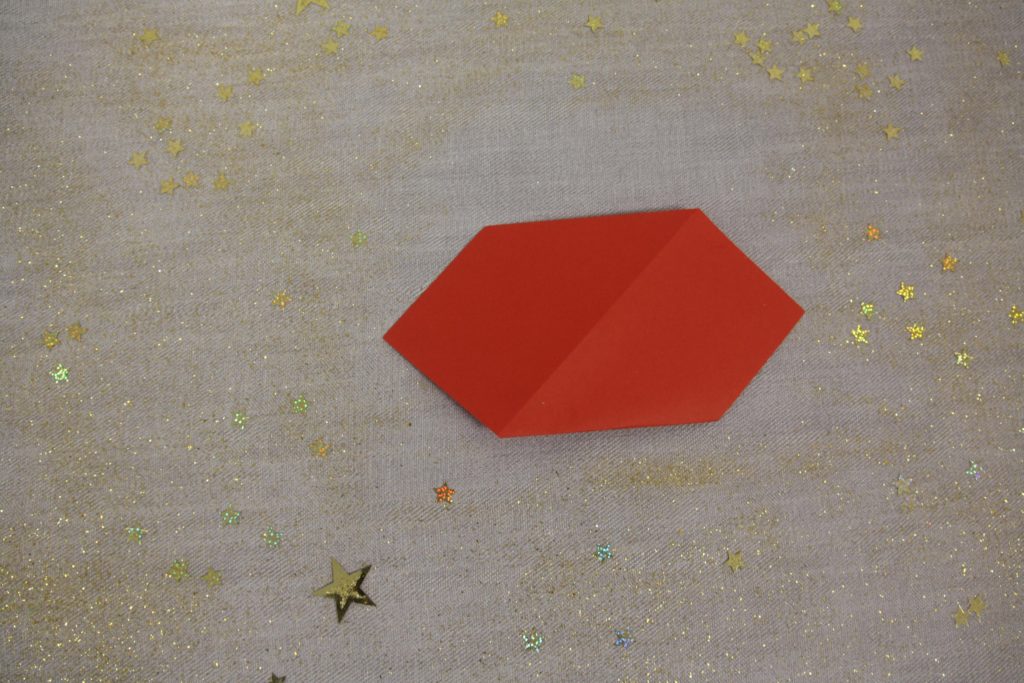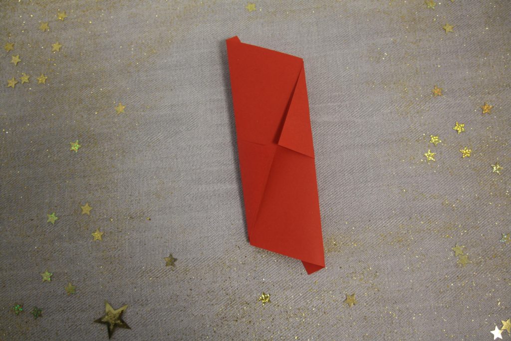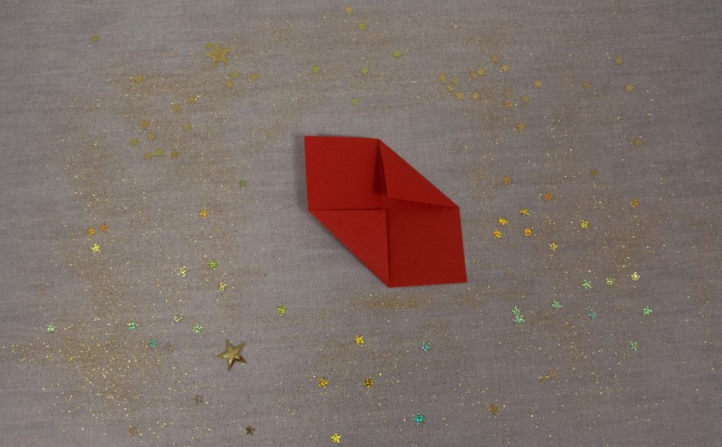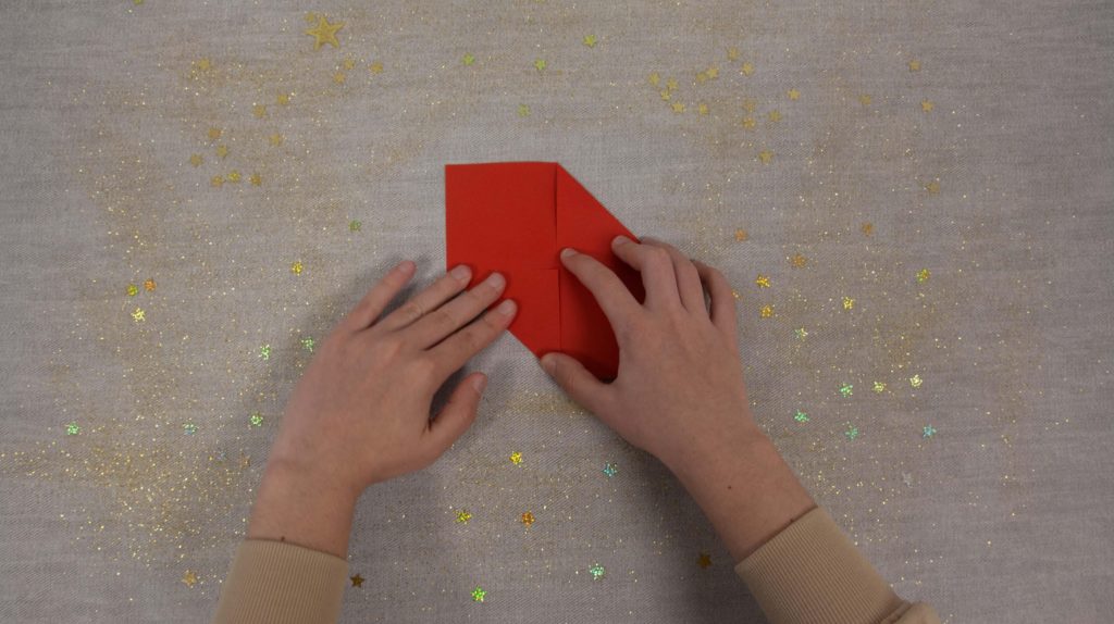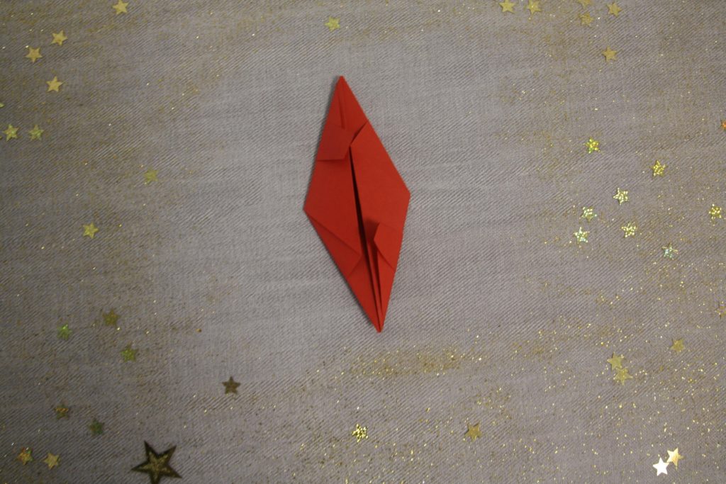 Jetzt müsst ihr einmal oben und unten die Ecke so umknicken, dass oben und unten jeweils eine Spitze entsteht.