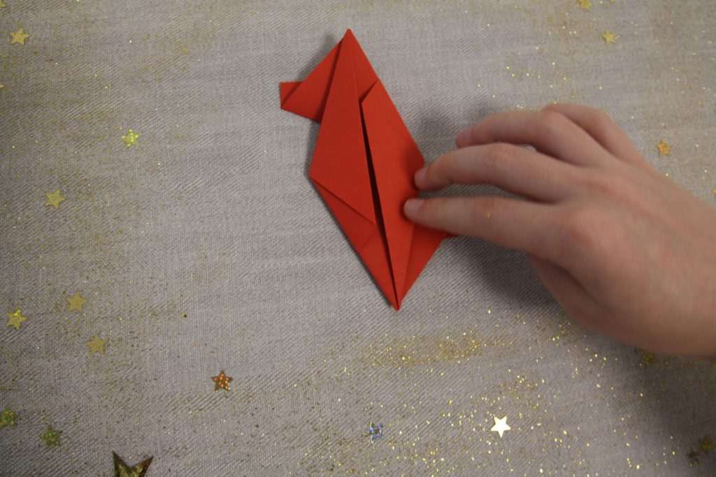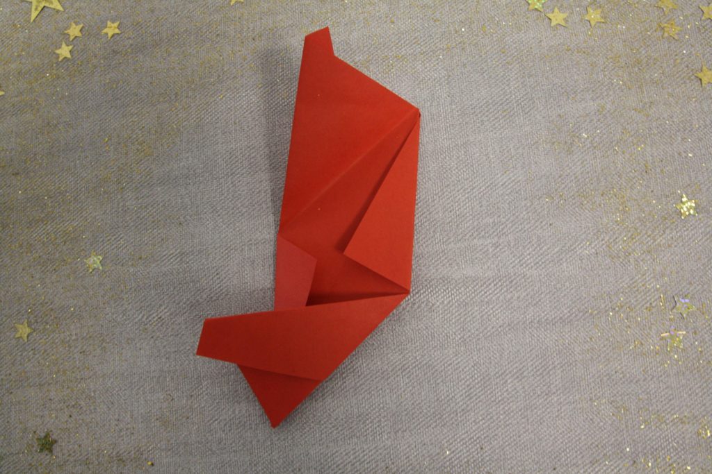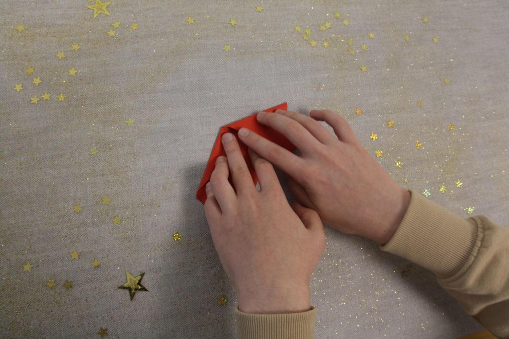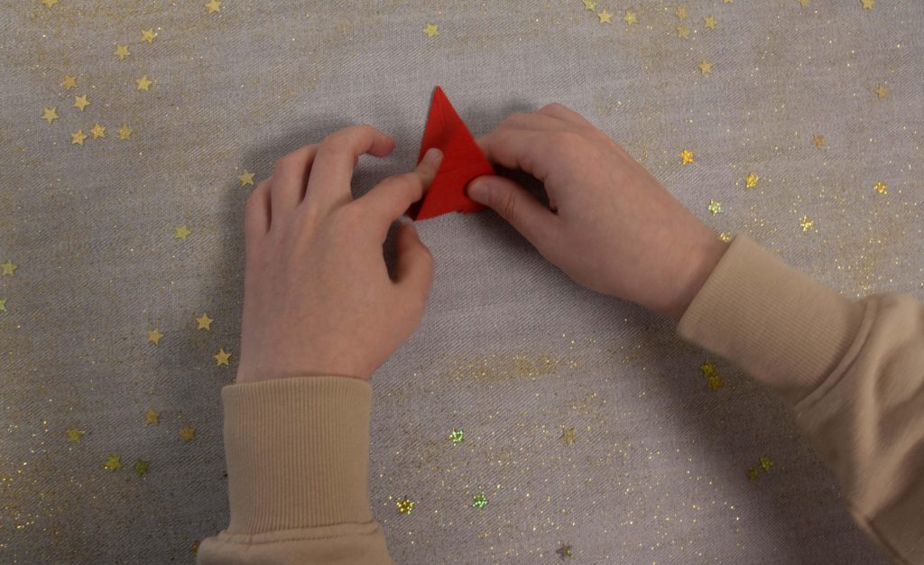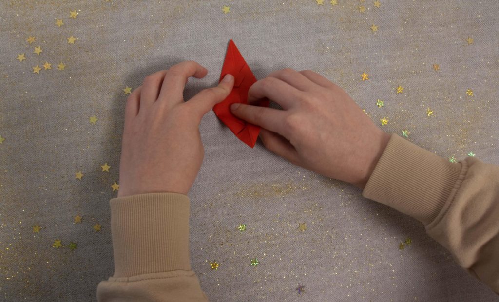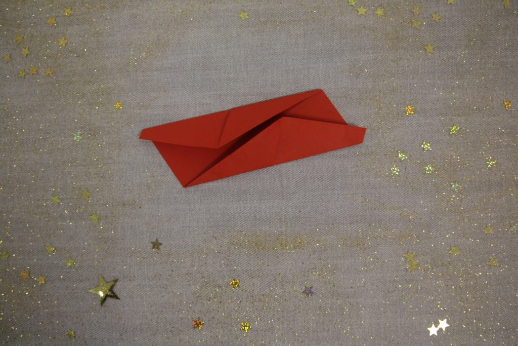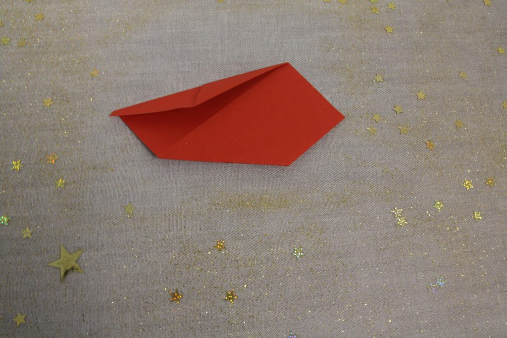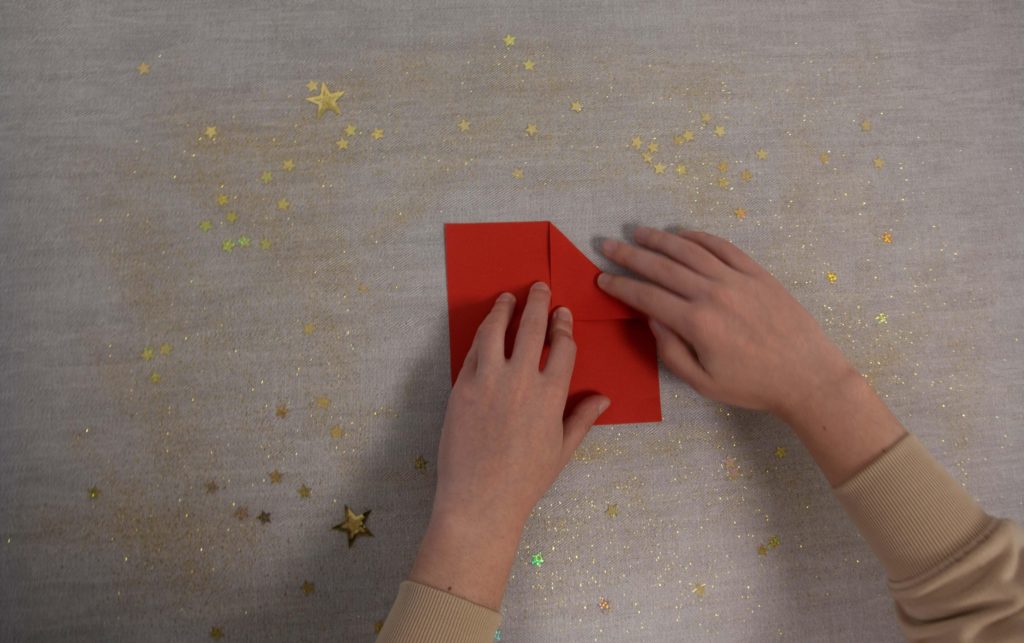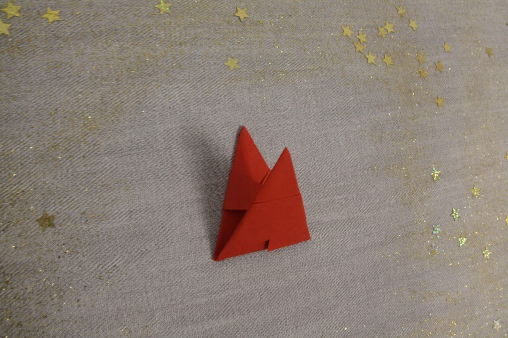 Habt ihr das gemacht, dann seht ihr zwei abstehende Stücke an beiden Seiten. Klappt diese nun um, sodass auf beiden Seiten eine Art Dreieck entsteht. Diese umgeklappten Seiten sollten die einzelnen Dreiecksseiten fixieren.