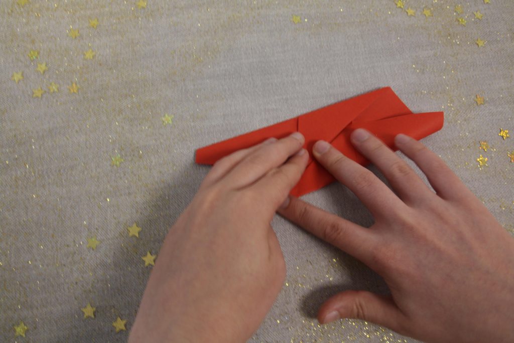 Wenn das richtig gemacht wurde, entsteht am Ende eine Spitze vom Stern. (Achtet darauf, dass diese geschlossen ist, damit es nicht auseinander fällt)