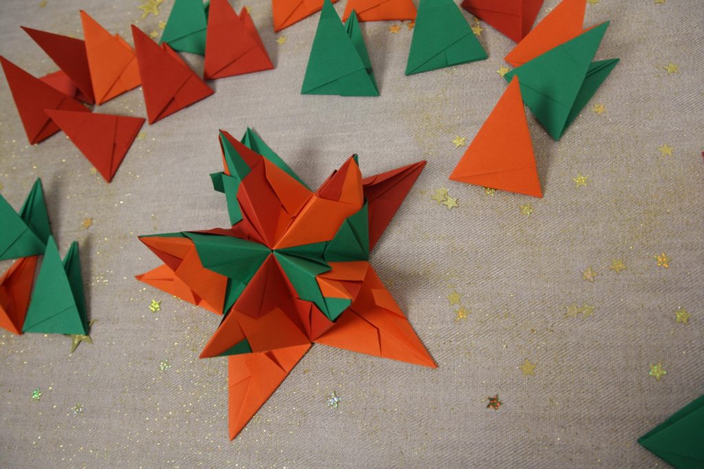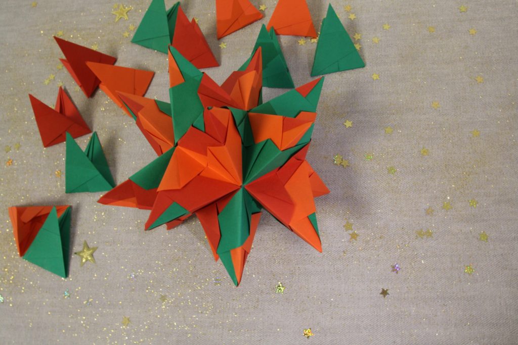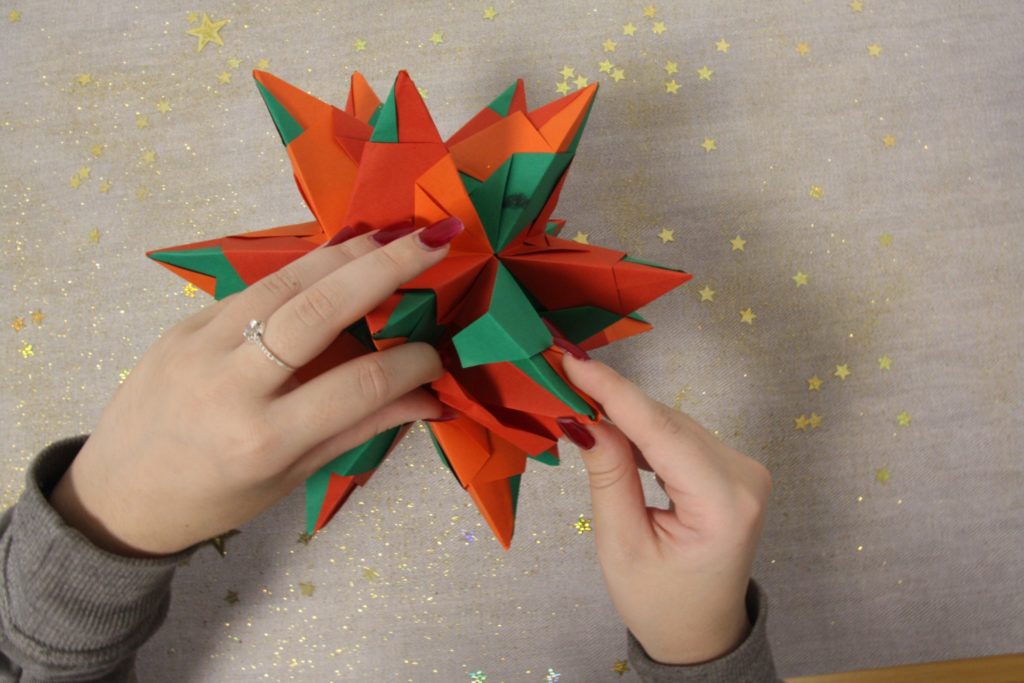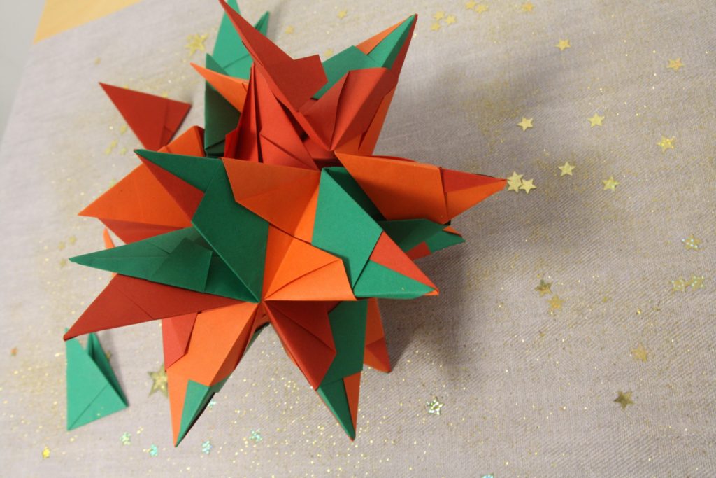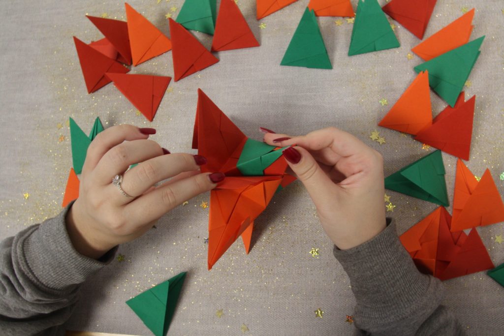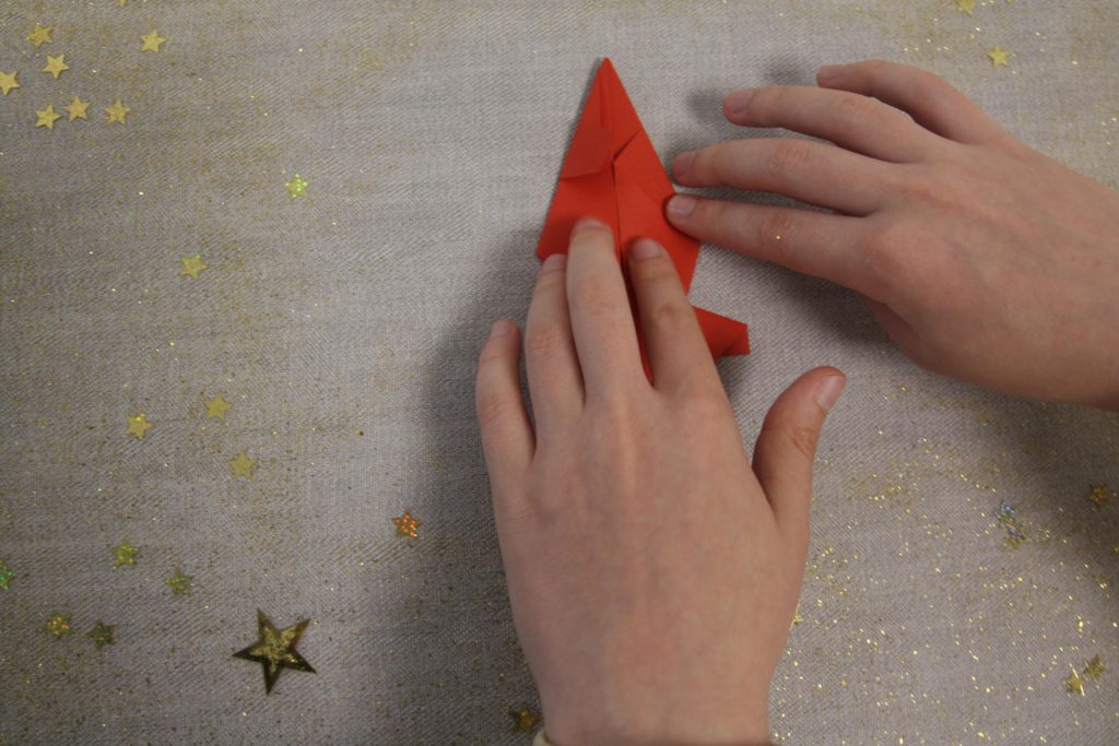Zunächst nehmen wir uns 3 gefaltete Ecken. Diese klappen wir leicht auf, in dem wir die Fixierung lösen (der vorletzte Schritt vom Falten des Blattes lösen). Haben wir alle 3 leicht aufgeklappt, so müssen wir die aufgeklappten Seiten so ineinander stecken, sodass ein dreizackiger Stern entsteht.