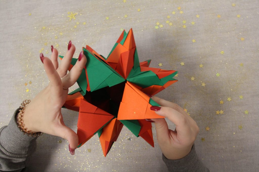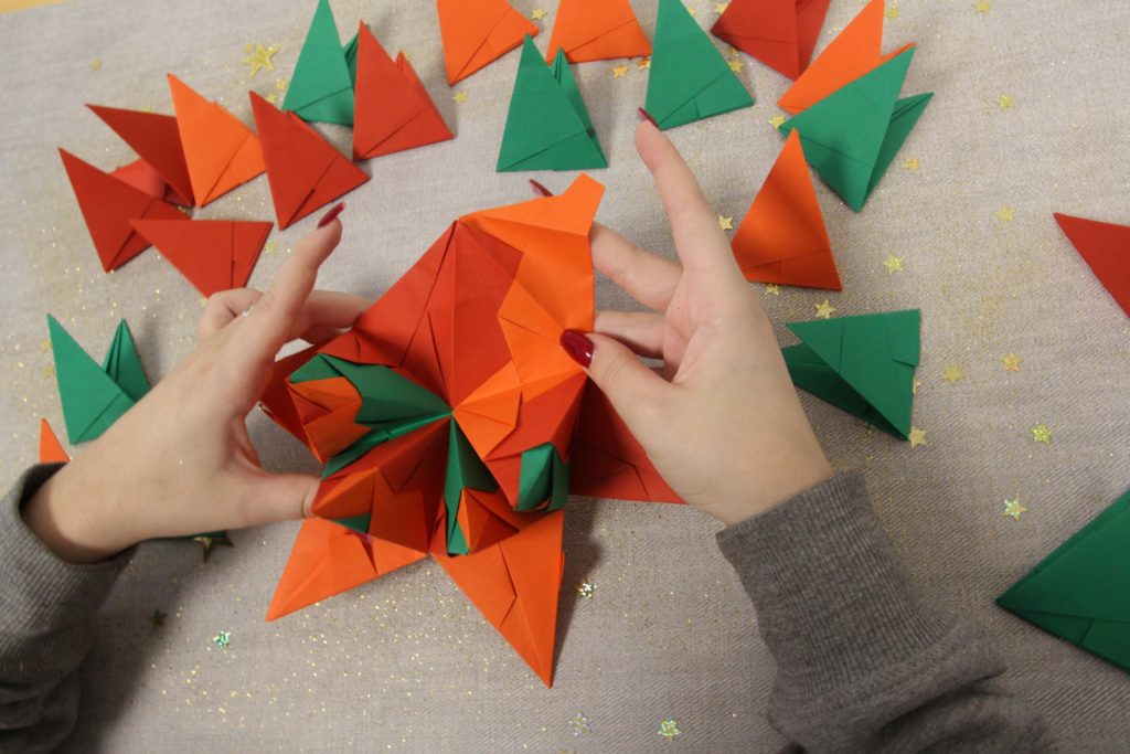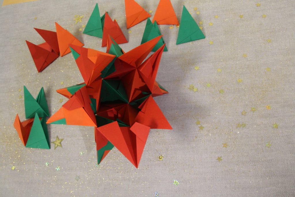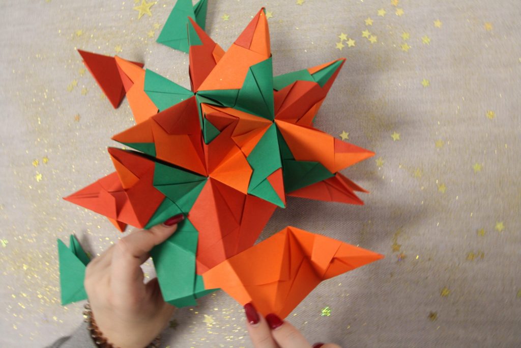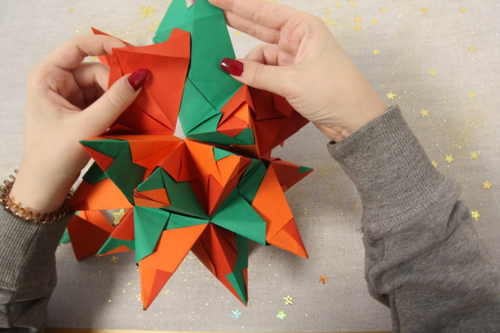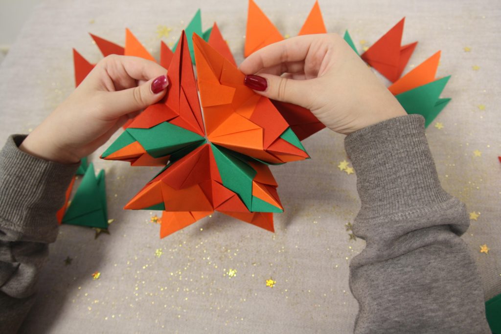 Zunächst nehmen wir uns 3 gefaltete Ecken. Diese klappen wir leicht auf, in dem wir die Fixierung lösen (der vorletzte Schritt vom Falten des Blattes lösen). Haben wir alle 3 leicht aufgeklappt, so müssen wir die aufgeklappten Seiten so ineinander stecken, sodass ein dreizackiger Stern entsteht.