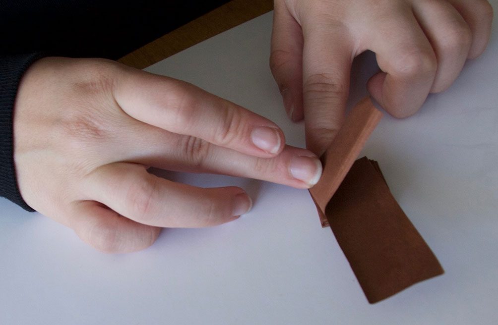 – das orangene Transparent Papier in kleine Fetzen reißen