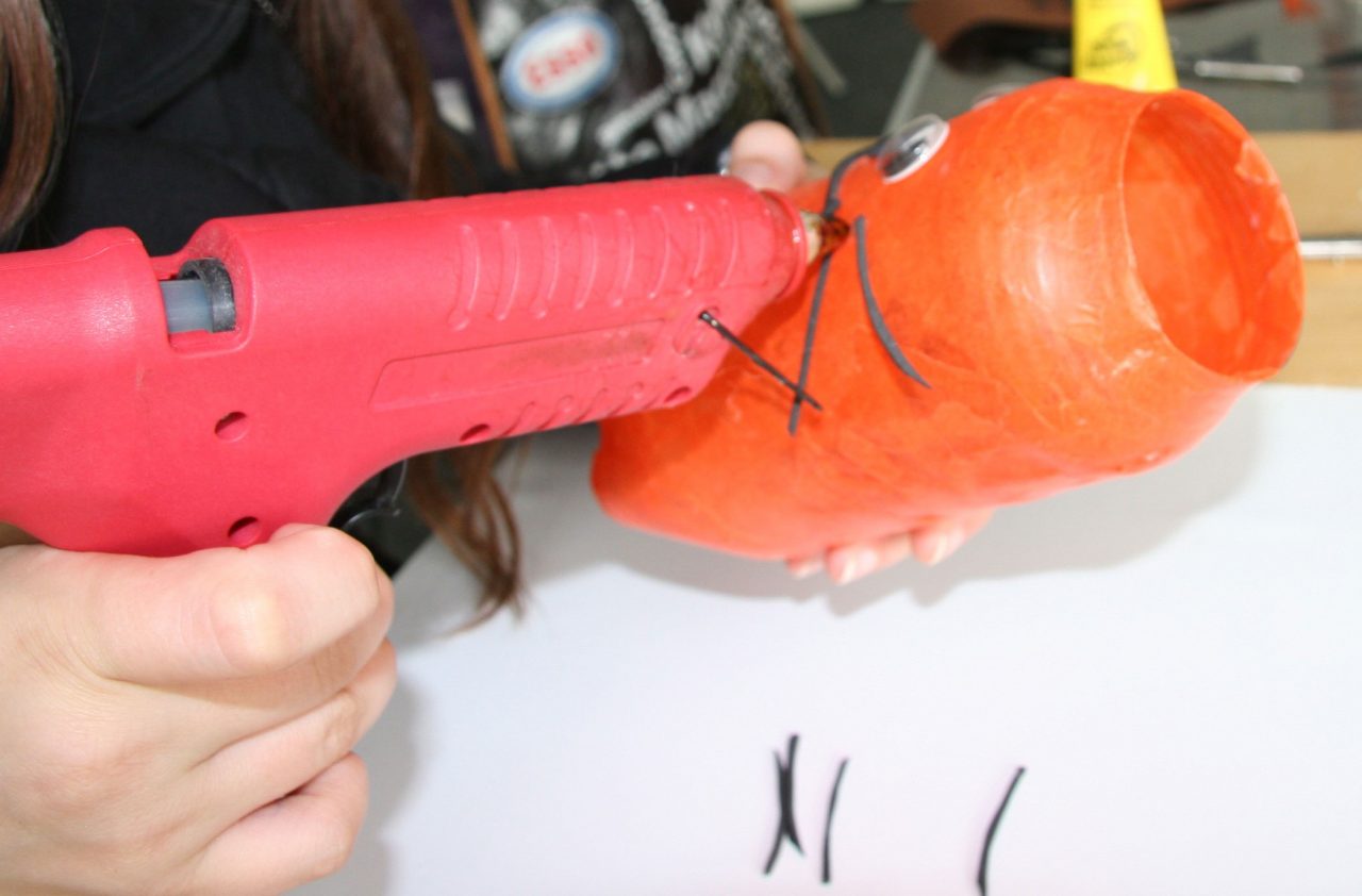 – anschließend die Stellen am Flaschenrand mit heißem Kleber vorbereiten, an welchen du die Ohren haben möchtest