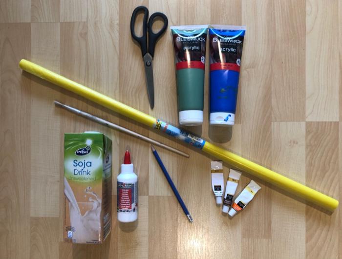 Zu Beginn braucht ihr die Schere, einen Bleistift und einen leeren Getränkekarton. Wenn ihr wisst, wie groß eure Laternenfenster sein sollen, könnt ihr zunächst eine einfache Skizze auf den Karton zeichnen. Ihr müsst nicht allzu genau sein, denn ihr könnt die Skizze später gegebenenfalls wieder wegradieren, oder einfach beim Verzieren mit etwas Farbe übermalen!