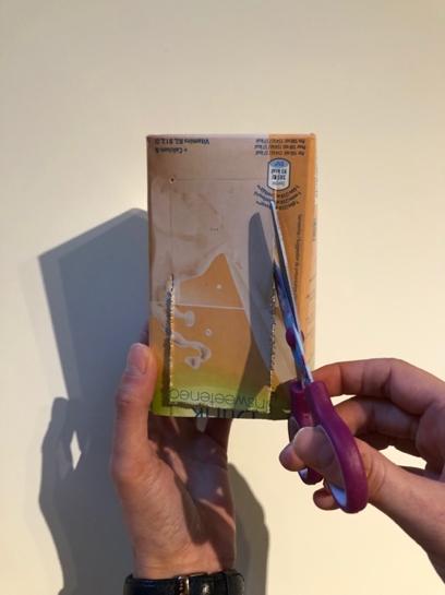 Schneidet den Getränkekarton in etwa zwei Drittel der Höhe durch und schneidet dann in jede der vier Seiten ein Fenster.