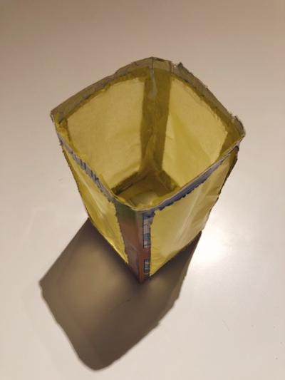 Schneidet 4 Streifen aus Transparentpapier zurecht, indem ihr den Getränkekarton einfach auf das Transparentpapier legt und diesen als ungefähre Vorlage für die Größe der Streifen verwendet. Danach klebt ihr die Streifen mit etwas Kleber an die Innenseiten des Getränkekartons.