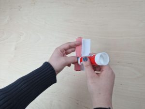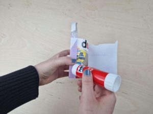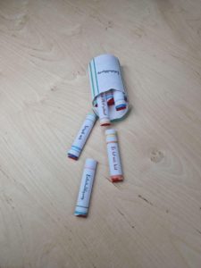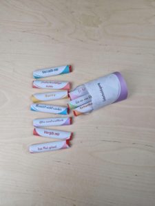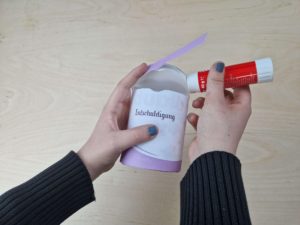 Danach nimmst du einen Duplo-Riegel legst die Vorlage auf den Duplo-Schriftzug, dann umwickelst du den Riegel mit der Vorlage und befestigst diese mit einem Klebestift oder Klebeband.