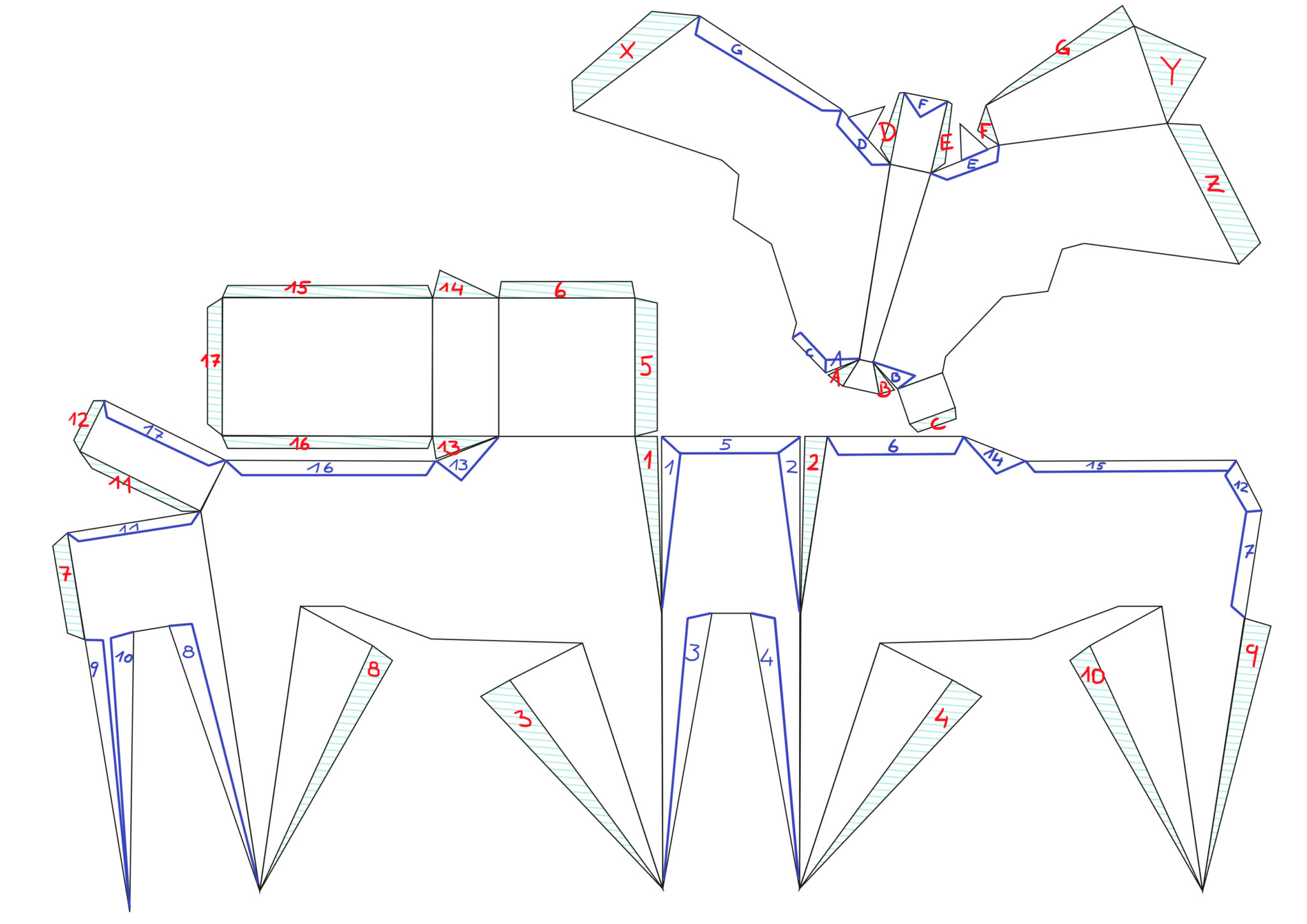 Wie ihr wahrscheinlich bemerkt habt, sind einige Flächen des Einhorns mit einem feinen Linienmuster versehen. Diese stellen die Klebeflächen dar. Ich habe euch dazu eine Klebeanleitung erstellt, die einen genaueren Überblick dazu gibt, wie geklebt wird. Es sieht auf den ersten Blick etwas kompliziert aus, aber ich werde es euch erklären. Diese könnt ihr euch auch hier herunterladen: Klebeanleitung.