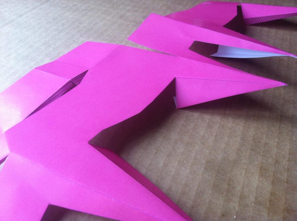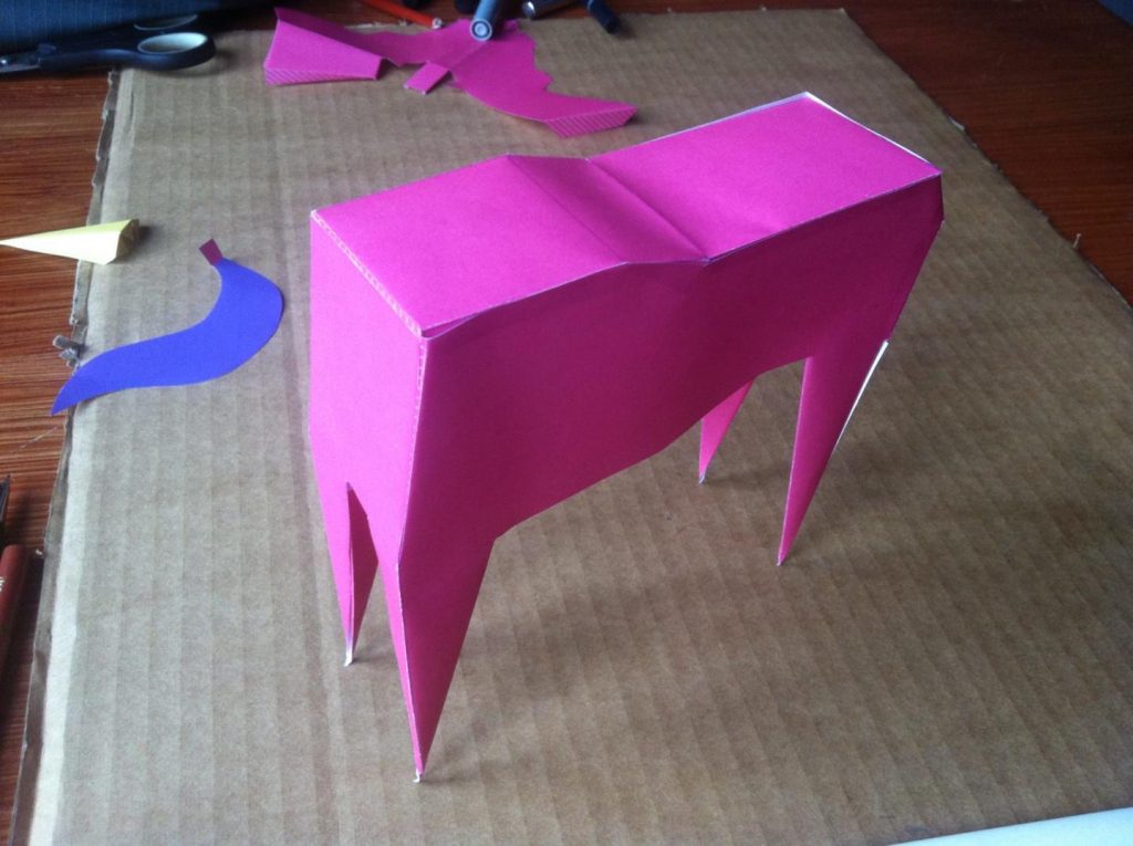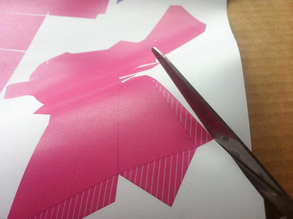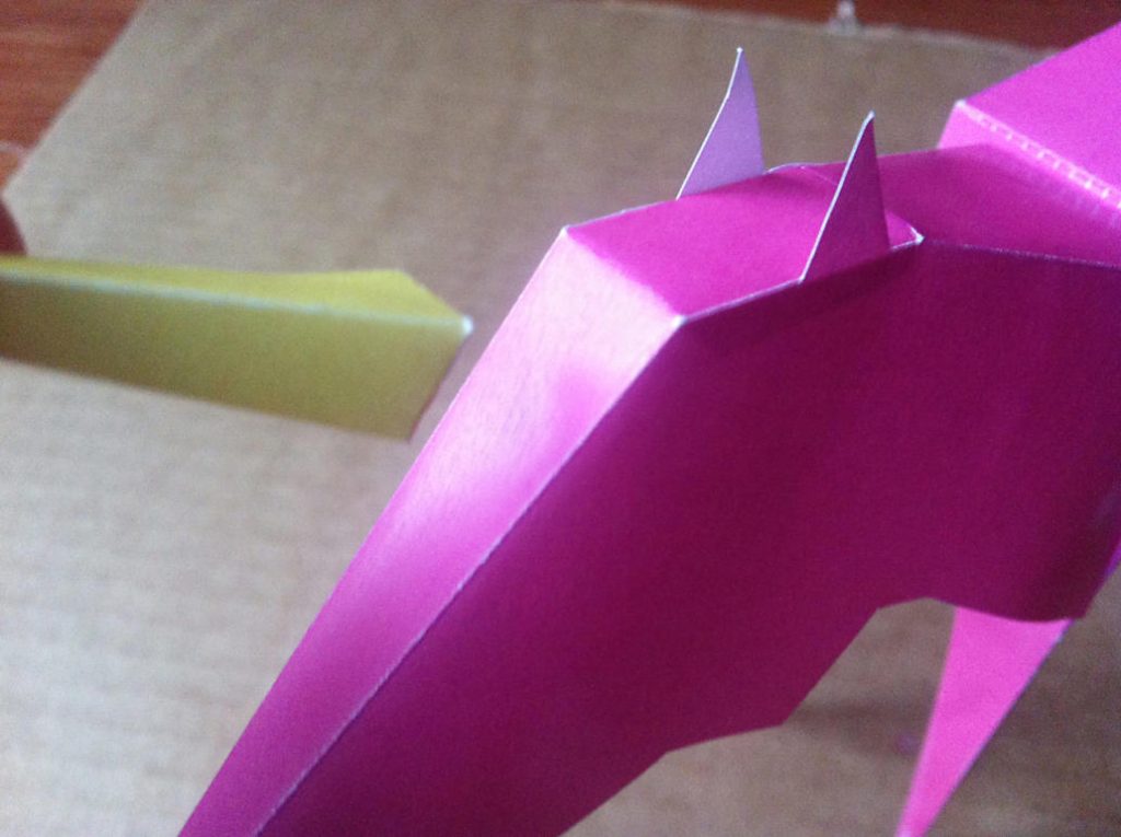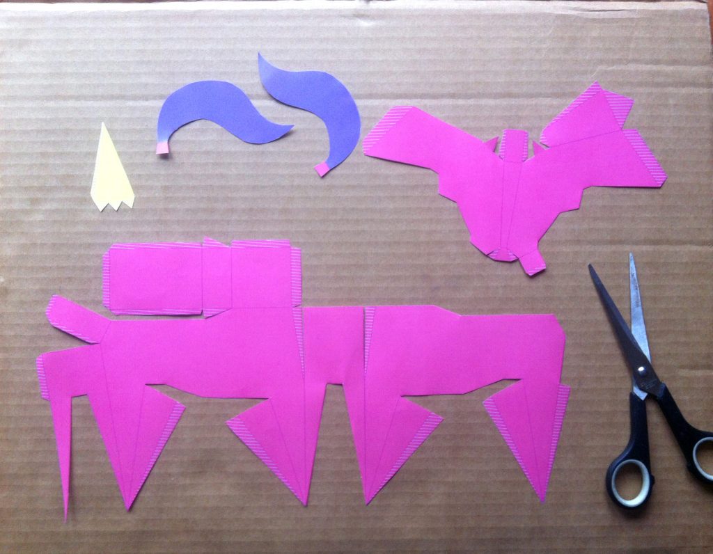 Bevor wir das Einhorn zusammenkleben, müssen wir die Vorlage zunächst einmal an den eingezeichneten Linien falten und knicken, damit wir das Einhorn schon mal in eine grobe Form bringen. Dazu nehme ich mir gerne ein Falzbein zur Hilfe. Man kann schon langsam erkennen, was es werden soll 🙂 Im nächsten Schritt können wir dann anfangen die Teile für das Kleben vorzubereiten.