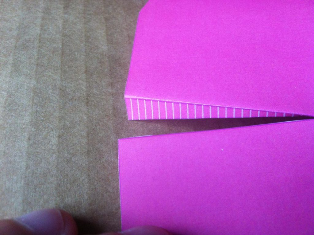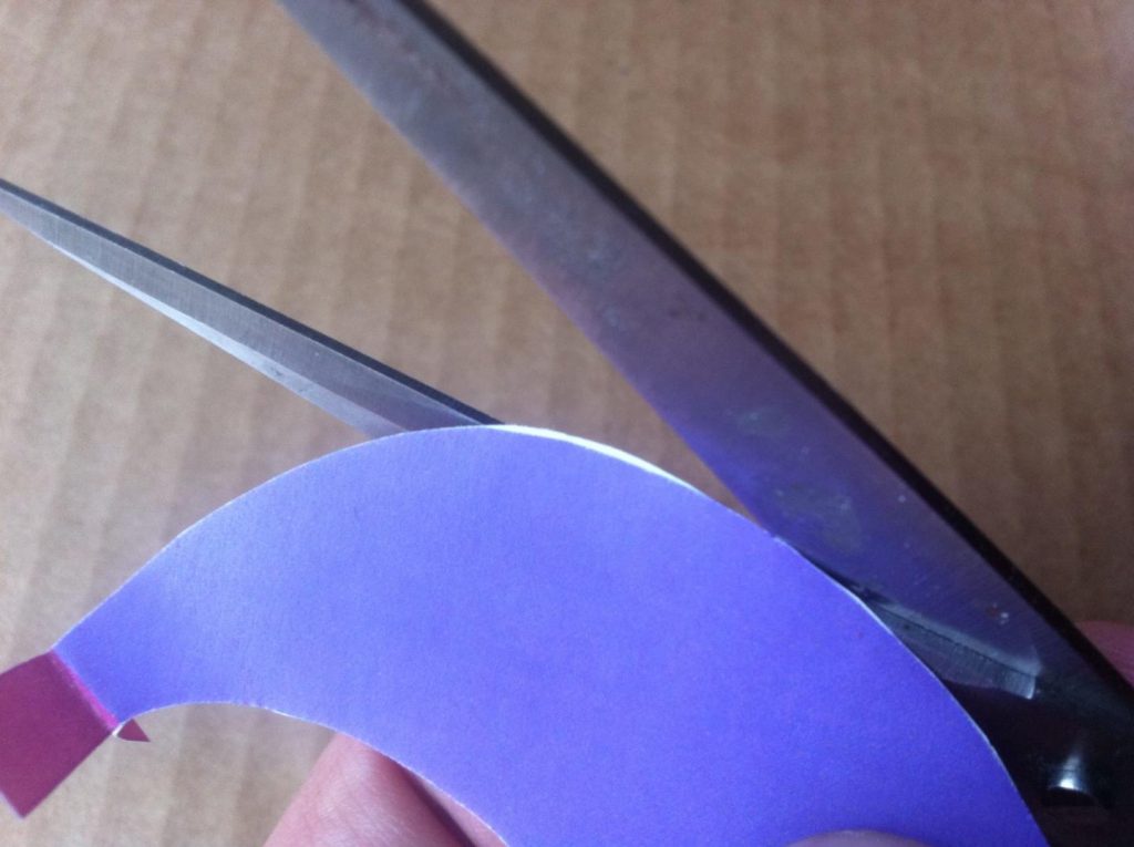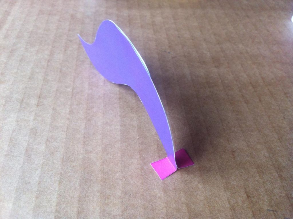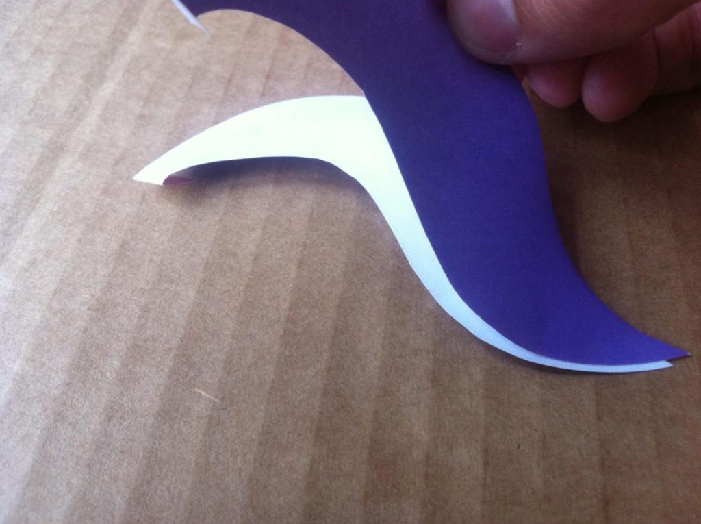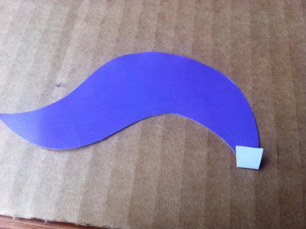 Den Schwanz klebe ich als letztes zusammen. Dazu klebe ich die zwei lilafarbenen Flächen gegeneinander und passe dabei auf, dass ich die rosa farbigen Flächen noch nicht mit Kleber bestreiche. Diese brauche ich später erst, um den Schwanz am Einhorn befestigen. Wenn ich den Schwanz nun soweit zusammengeklebt habe, schneide ich ihn noch einmal ein bisschen nach, um die unschönen weißen Flächen zu entfernen.