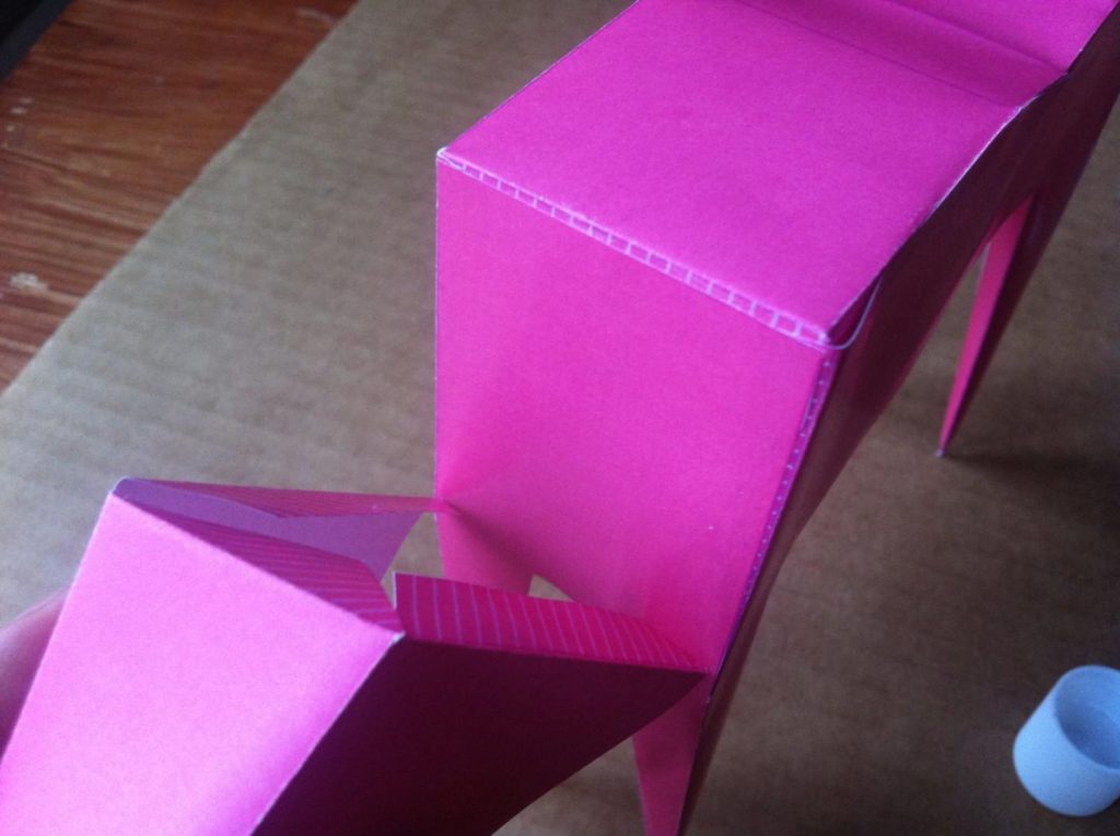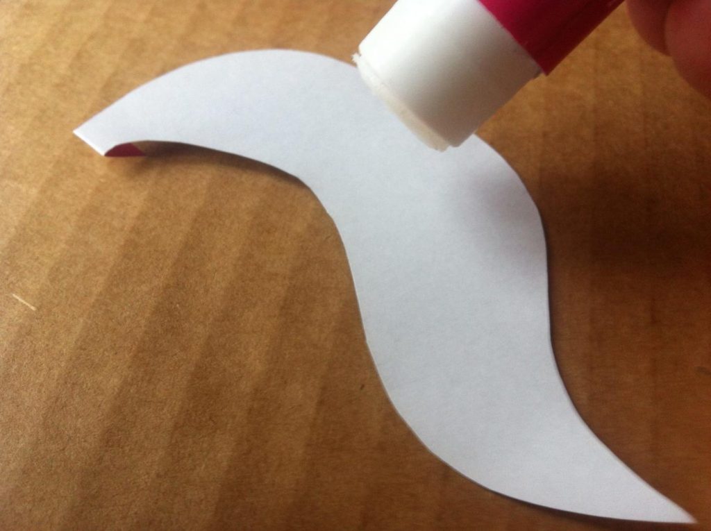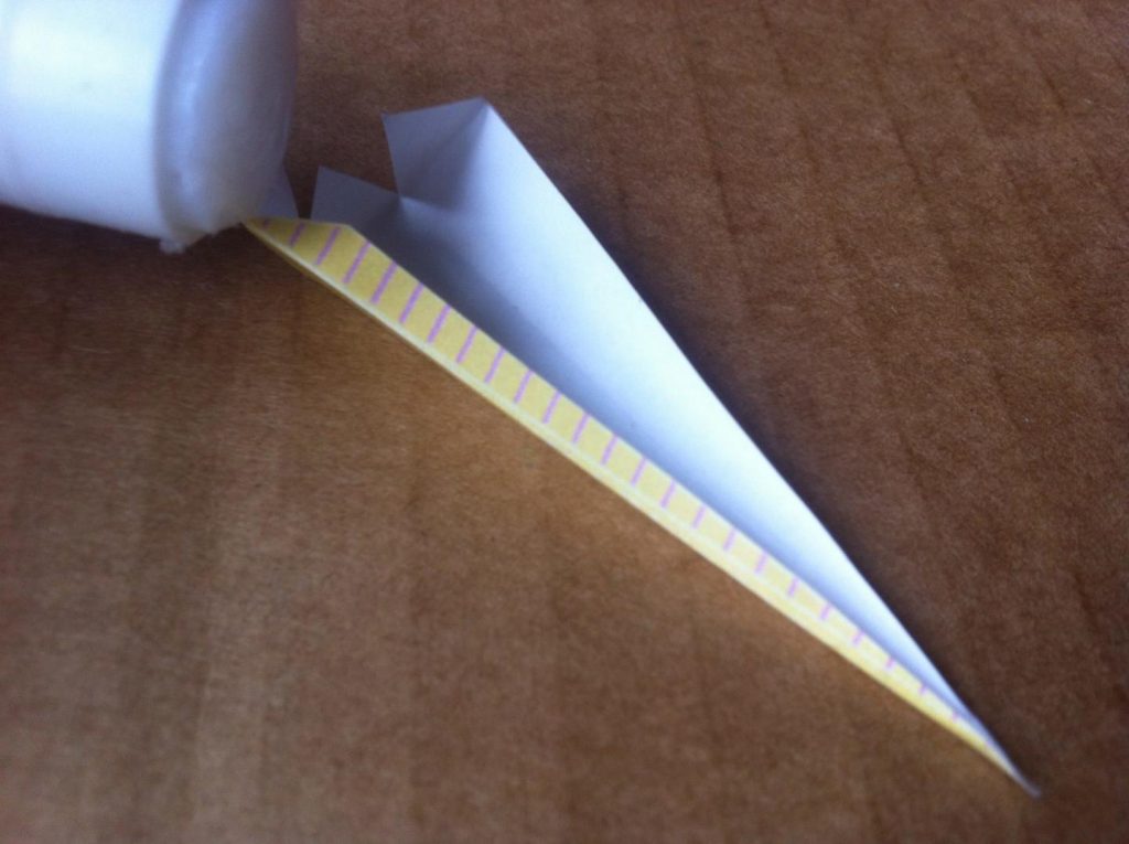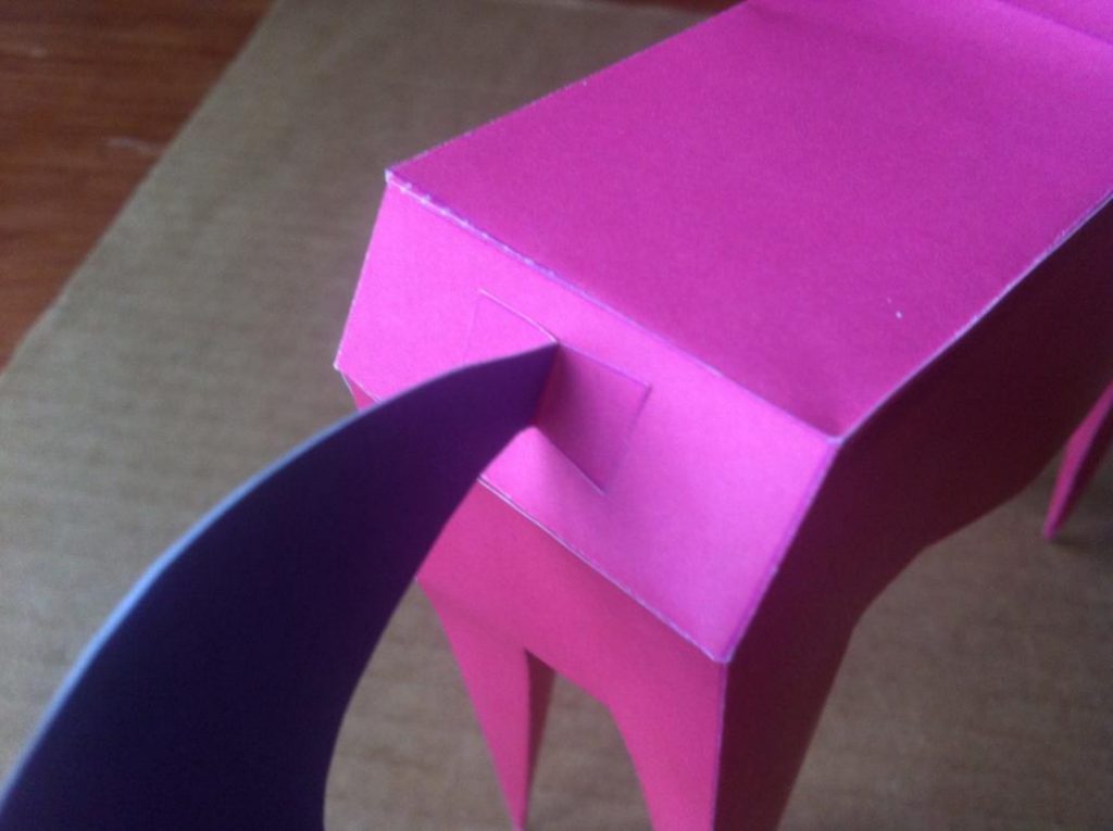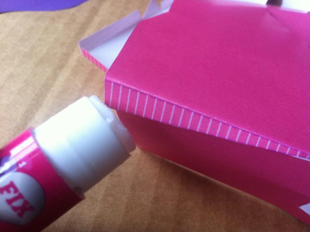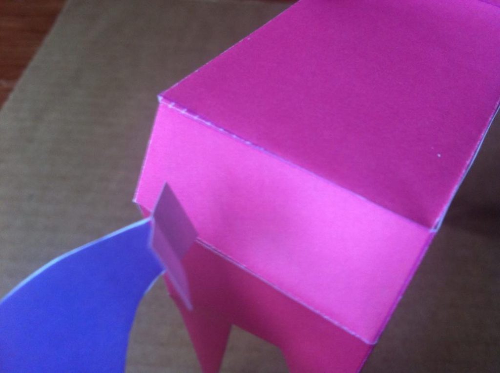 Danach nehme ich mir den Schwanz, klappe die beiden rosa farbigen Flächen auseinander und schmiere Kleber auf die weiße Seite. Dann befestige ich auch den Schwanz am Einhorn.