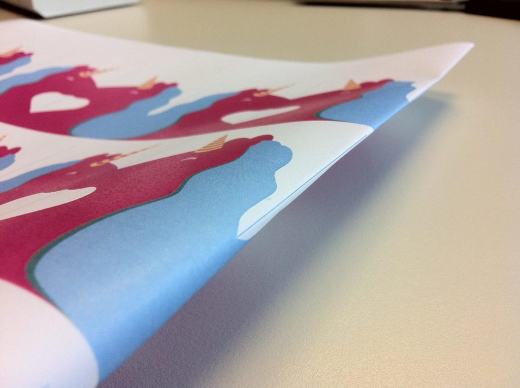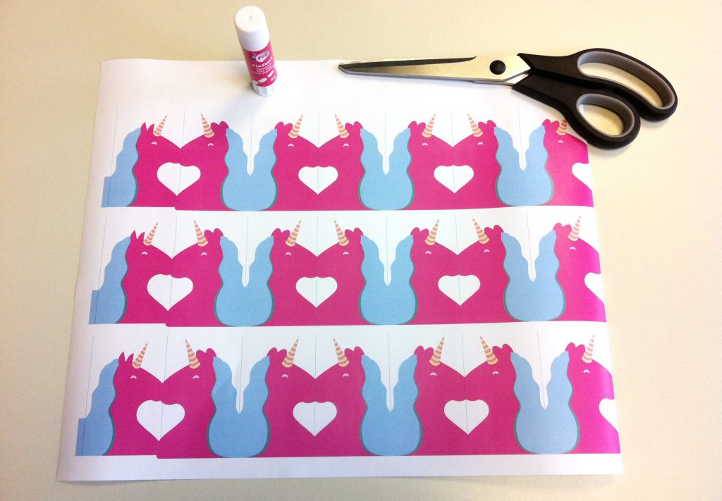 Und genau so werde ich meine Einhorn-Krone angehen. Dazu habe ich mir am Computer zwei Einhörner gemalt, die sich küssen. Diese habe ich dann so oft hintereinander kopiert, dass sie eine Kette ergeben und diese dann auf einem A3 Papier ausgedruckt.