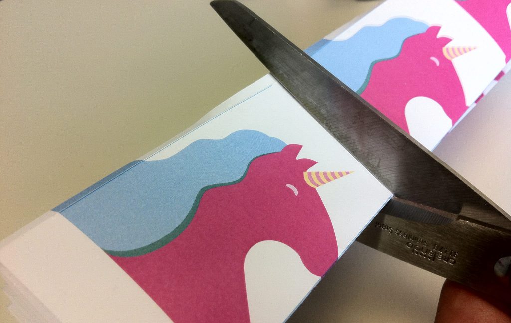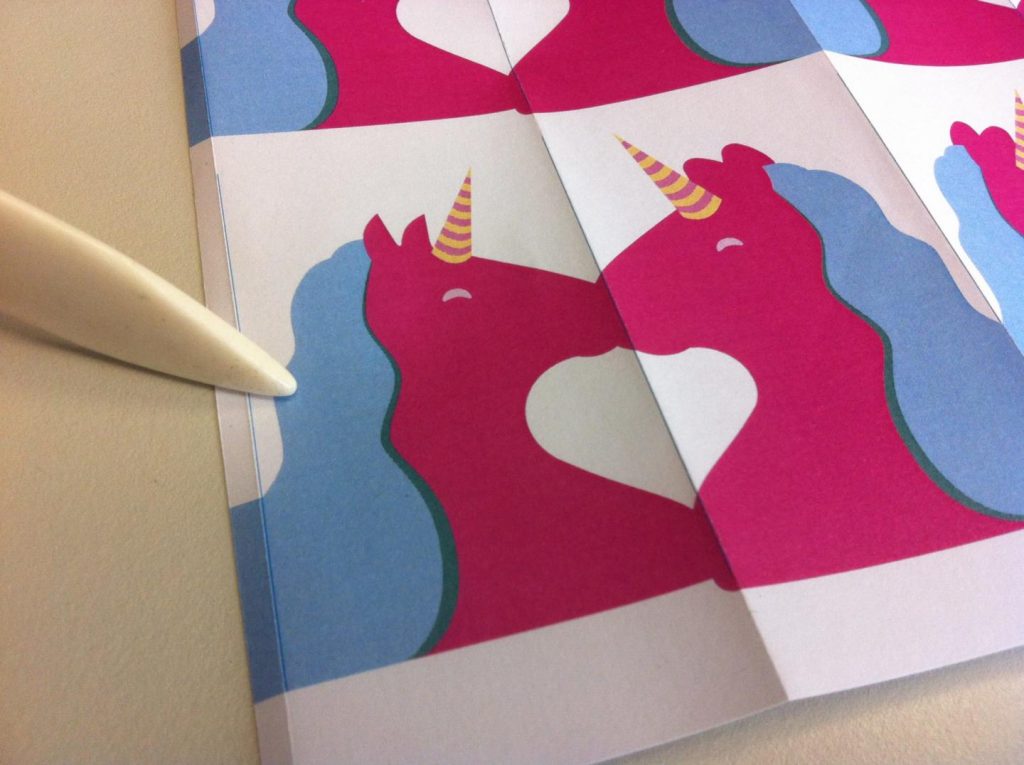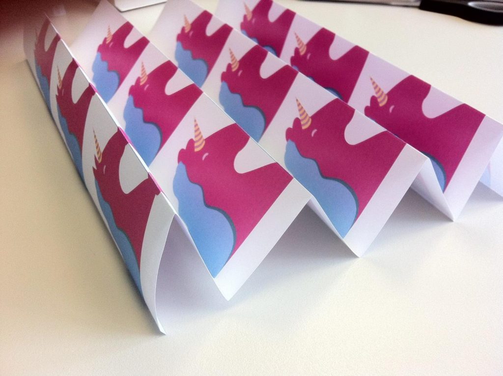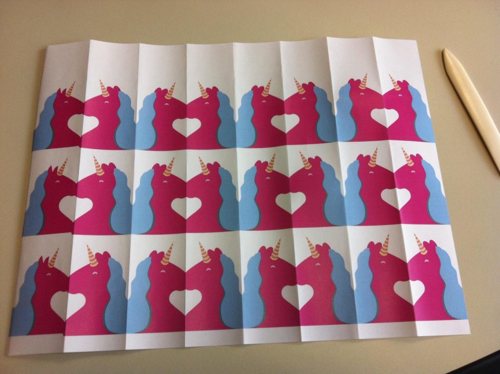 Nun lege ich die Einhörner im Zick-Zack übereinander, so dass ich sie gleich bequem zusammen ausschneiden kann.