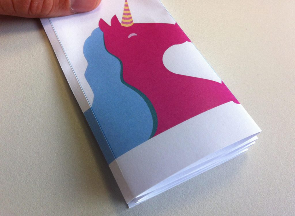 Wenn nun alles fertig gefaltet ist, sollte euer Papier so aussehen, wie ihr es hier seht. Das Einhorn ganz links hat dabei eine extra Lasche. Diese wird später benötigt, um die Einhorn-Krone zusammen zu kleben.