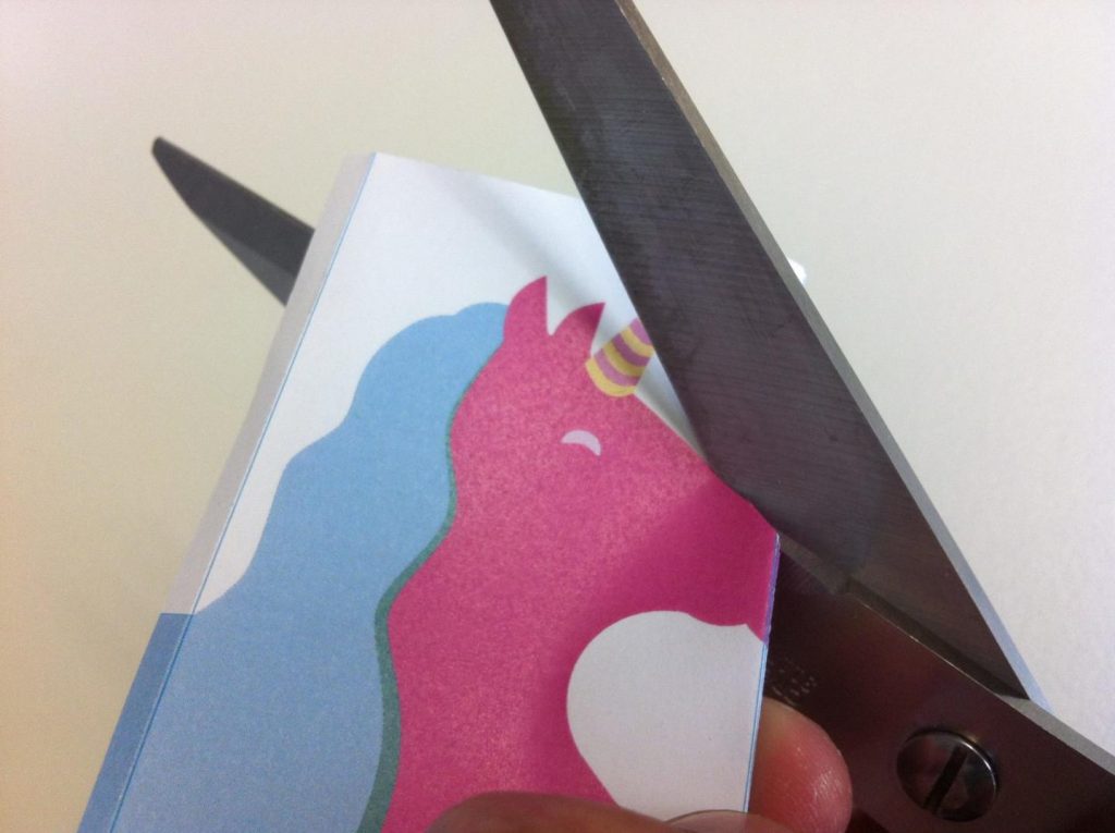 Nun darf geschnippelt werden. Stellt sicher, dass das Einhorn mit der Lasche nun oben liegt und fangt and die weissen Flächen wegzuschneiden, bis nur noch das farbige Einhorn übrig bleibt. Wenn ihr damit fertig seid, dann kann die Einhorn-Krone schon ausgebreitet werden und ihr habt nun eine kleine Einhorn-Girlande vor euch liegen. Dabei sollten nun auch alle Einhörner gleich groß sein.