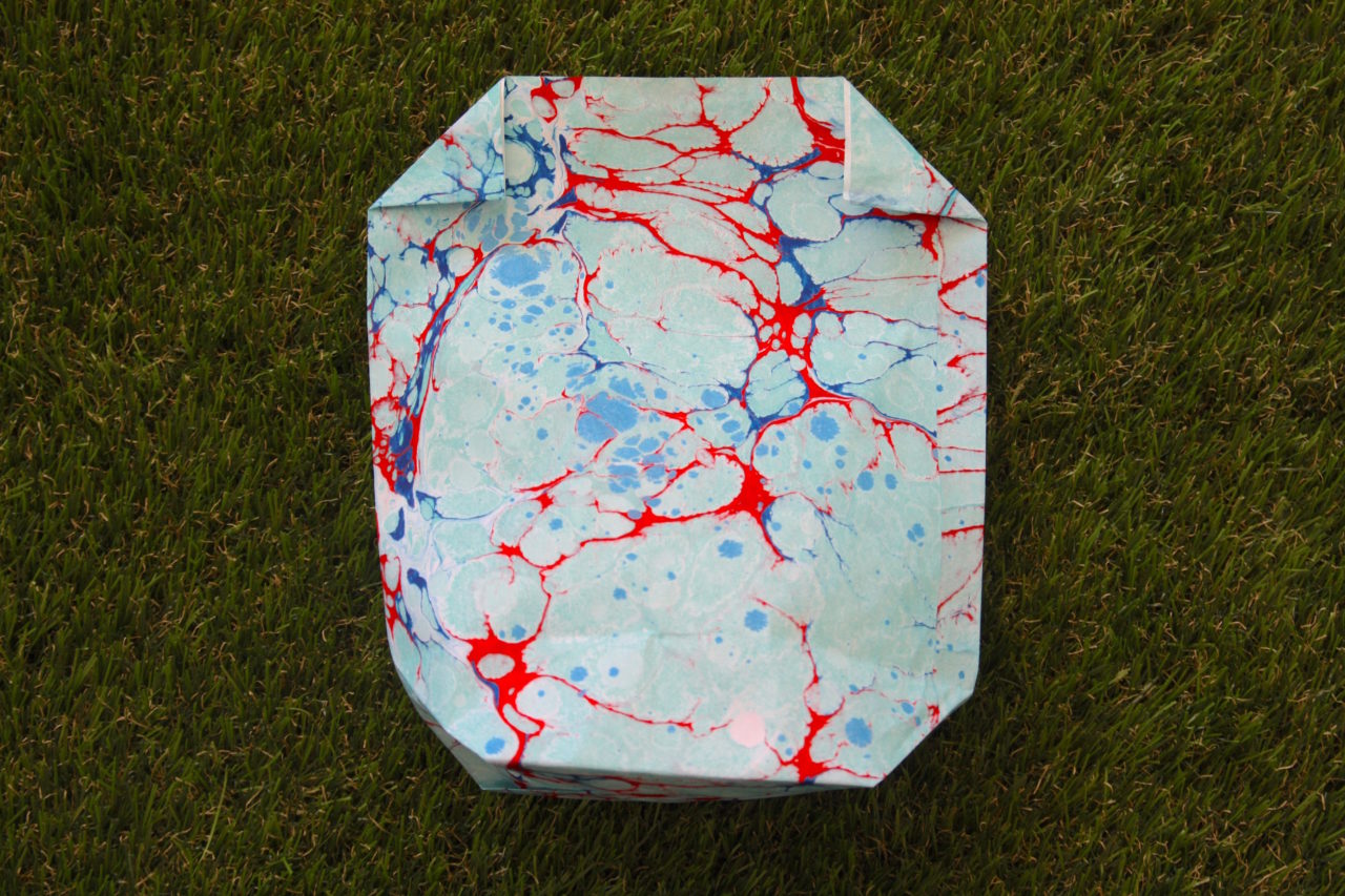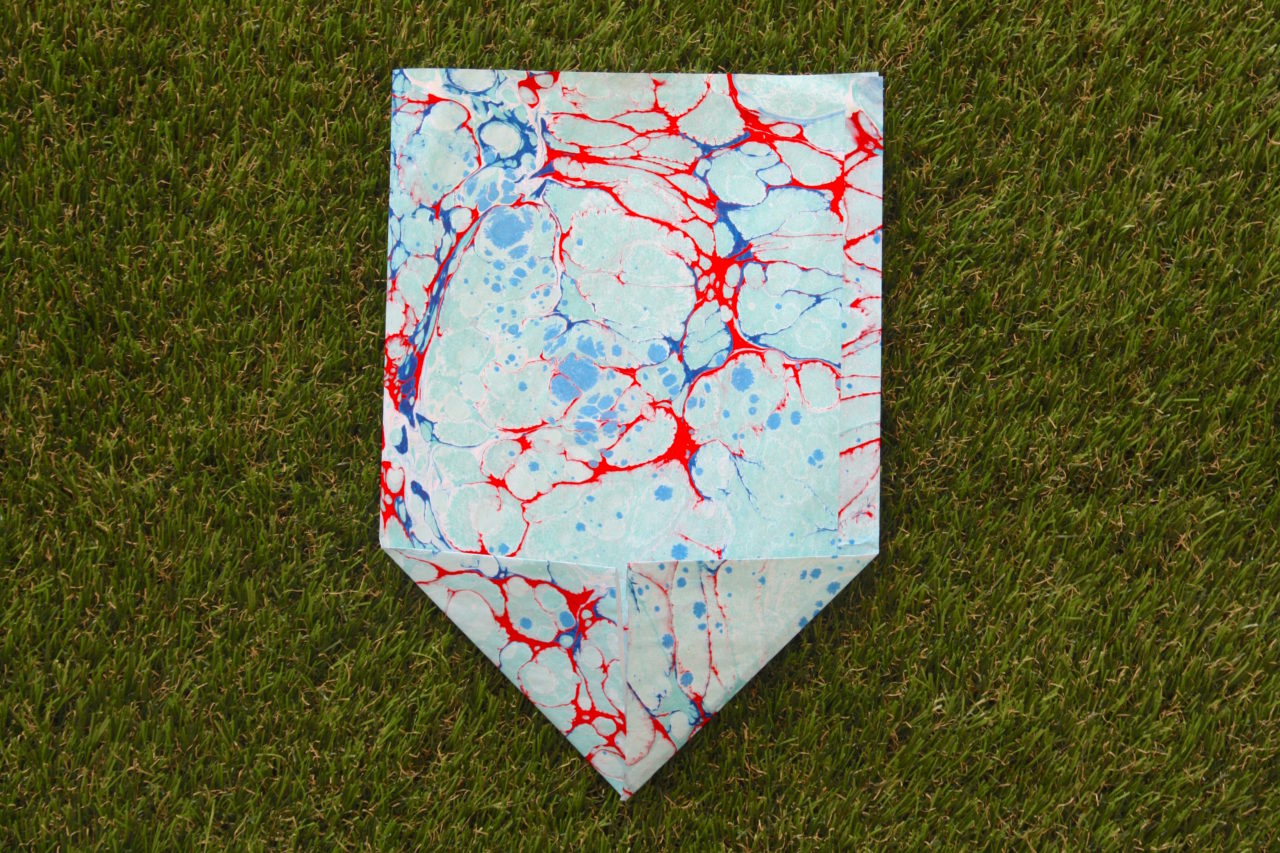 Das Rechteck einmal leicht in der Mitte falten, um die Mitte zu markieren. Dann werden die beiden unteren Ecken zur Mitte gefaltet. Jetzt faltest du die beiden unteren Ecken wieder zurück, öffnest das Papier an der unteren Seite und faltest die obere Lage des Papiers nach oben, sodass ein Quadrat entsteht. Falte dann die untere Ecke des Quadrats nach oben, sodass sie die Mittellinie überlappt. Die oberste Ecke bestreichst du mit Kleber und faltest sie so nach unten, dass sie mit der Spitze an der geraden Seite der unteren Ecke abschließt.