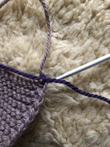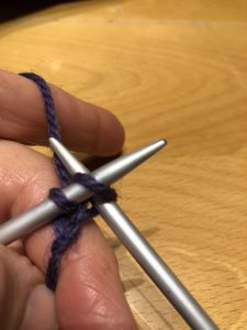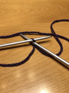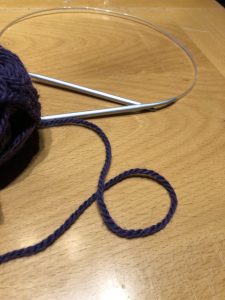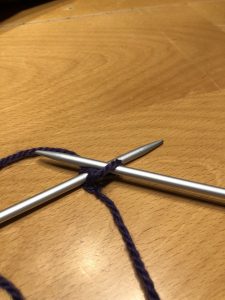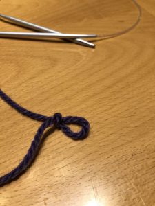 So, los geht’s! Du fängst mit der Farbe lila an. Als allererstes musst du eine Schlaufe machen, mit der du die Maschen aufnimmst. Die Schlaufe steckst du auf die linke Nadel und stichst die zweite Nadel von links in die Schlaufe, holst von hinten den Faden nach vorne und ziehst ihn durch die Schlaufe. Diese neue Masche verdrehst du und legst sie auf der linken Nadel ab. Das machst du so lange, bis du 40 Maschen aufgenommen hast.