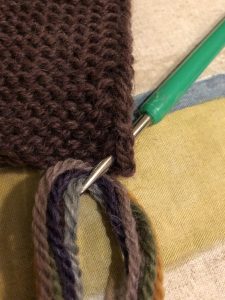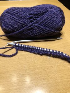 Wenn du dann findest, der Schal ist lang genug, dann strickst du die Maschen wieder ab. Dazu strickst du die ersten beiden Maschen wie gewohnt. Dann nimmst du mit der linken Nadel die zu erst gestrickte Masche der rechten Nadel auf und ziehst diese über die zweite Masche. Dann strickst du wieder ganz normal eine Masche und ziehst die erste Masche über die zweite wie oben beschrieben. Mit Bildern erklärt findest du diesen Vorgang in unserem Blogbeitrag „Kalte Füsse ade – kuschelig warme Schuheinlagen selbst gestrickt“.