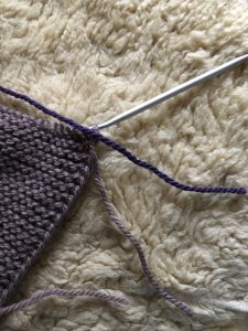 Wenn ein Farbwechsel ansteht, nimmst du den neuen Faden und verknotest ihn mit dem vorherigen Faden. Nicht zu fest, damit du den Knoten später wieder lösen kannst. Den vorherigen Faden schneidest du ab. Aber nicht zu kurz (ca. 15 cm), damit du den Faden noch ordentlich vernähen kannst. Dann strickst du einfach mit der neuen Farbe weiter.