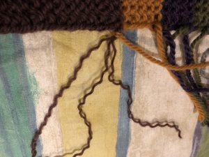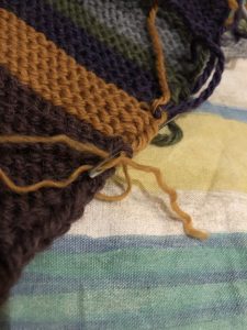 Fast fertig! Dein vorletzter Schritt besteht darin, die Fäden zu vernähen. Das ist wirklich lästig, aber es muss sehr sorgfältig gemacht werden, damit der Dr. Who Schal zum Schluss auch schön aussieht. Optimal wird es, wenn du den Faden jeweils teilst und ihn dann in der entsprechenden Farbe vernähst.