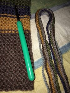 Der Dr. Who Schal ist beinahe fertig. Zum Schluss nur noch die Verschönerungsarbeit: Fransen!