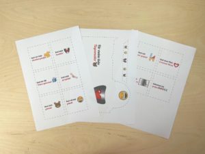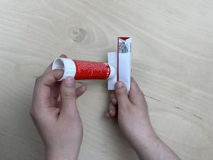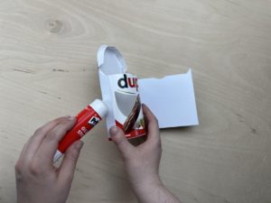 Danach nimmst du einen Duplo-Riegel legst die Vorlage so auf den Duplo-Schriftzug, dass das „du“ noch zu sehen ist. Dann umwickelst du den Riegel mit der Vorlage und befestigst diese mit einem Klebestift oder Klebeband.