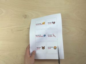 Nun schneidest du die einzelnen „Sprüche“ aus. Ich empfehle dir, diese innen am Rand auszuschneiden, so hast du die Umrandungslinie direkt weggeschnitten.