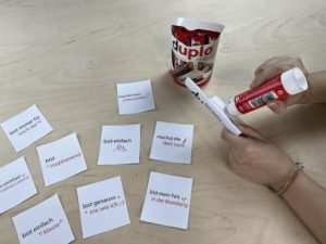 Danach nimmst du einen Duplo-Riegel legst die Vorlage so auf den Duplo-Schriftzug, dass das „du“ noch zu sehen ist. Dann umwickelst du den Riegel mit der Vorlage und befestigst diese mit einem Klebestift.