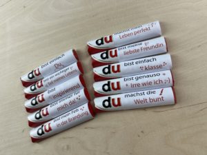 Stell dir vor, wie ihre Augen leuchten werden, wenn sie die zehn individuell gestalteten Duplo Riegel in den Händen hält. Jeder einzelne Riegel ist umhüllt von einer Banderole, die nicht nur optisch ein Highlight ist, sondern auch eine liebevolle Botschaft bereithält. Das Besondere an diesen Banderolen ist, dass sie auf dem Riegel so positioniert sind, dass das „du“ von Duplo stehen bleibt. So entsteht eine direkte Ansprache und jeder Spruch beginnt mit einem liebevollen „du“.