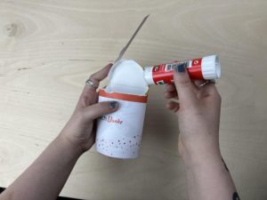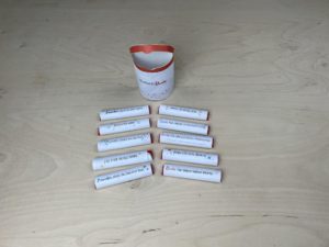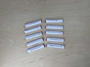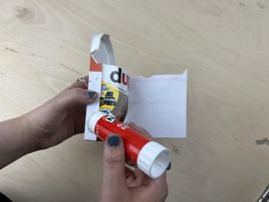 Danach nimmst du einen Duplo-Riegel legst die Vorlage so auf den Duplo-Schriftzug, dass das „du“ noch zu sehen ist. Dann umwickelst du den Riegel mit der Vorlage und befestigst diese mit einem Klebestift oder Klebeband.