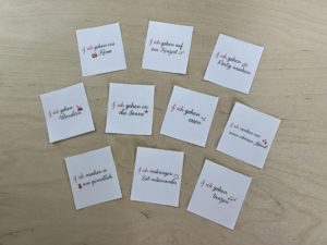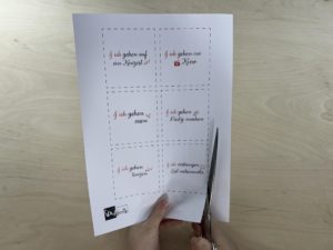 Nun schneidest du die einzelnen „Sprüche“ aus. Ich empfehle dir, diese innen am Rand auszuschneiden, so hast du die Umrandungslinie direkt weggeschnitten.