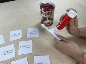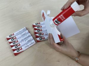 Danach nimmst du einen Duplo-Riegel legst die Vorlage so auf den Duplo-Schriftzug, dass das „du“ noch zu sehen ist. Dann umwickelst du den Riegel mit der Vorlage und befestigst diese mit einem Klebestift.
