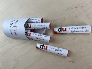 Die Besonderheit an diesen Banderolen ist, dass du sie so um den Duplo Riegel legst, dass das „Du“ von Duplo sichtbar bleibt. Dieses „Du“ wird Teil des Gutscheins und schafft so eine direkte und persönliche Ansprache. „Du & Ich gehen heute tanzen“, könnte es zum Beispiel heißen. So wird der Gutschein zu einer direkten Einladung, Zeit miteinander zu verbringen.