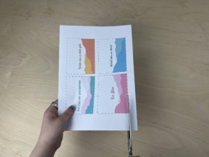 Nun schneidest du die einzelnen „Sprüche“ aus. Ich empfehle dir, diese innen am Rand auszuschneiden, so hast du die Umrandungslinie direkt weggeschnitten.