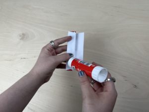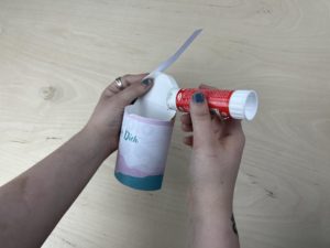 Danach nimmst du einen Duplo-Riegel legst die Vorlage so auf den Duplo-Schriftzug, dass das „du“ noch zu sehen ist. Dann umwickelst du den Riegel mit der Vorlage und befestigst diese mit einem Klebestift oder Klebeband.