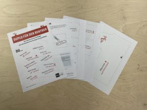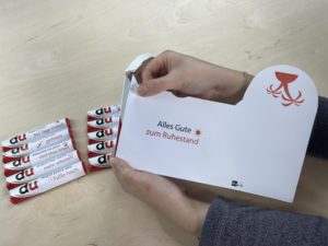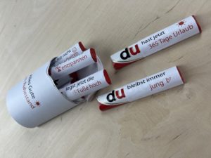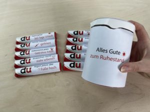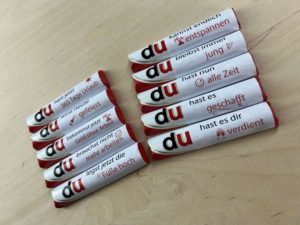 Das Besondere an diesen Banderolen: Du kannst sie so um die Duplo Riegel legen, dass das „du“ von Duplo sichtbar bleibt. So ergibt sich die Möglichkeit, mit dem „du“ liebevolle und persönliche Botschaften direkt an den frisch gebackenen Rentner oder die Rentnerin zu richten.